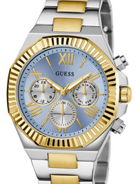 stainless steel quartz 44mm Highlights - 44mm - Light blue/gold-tone - Stainless steel - Octagonal face - Roman numeral dial - Baton hands - Chronograph counters - Date indication - Battery-operated movement - Two chronograph pushers - Screw-down crown - Adjustable link bracelet - Folding clasp - This item comes with a standard one-year warranty from the boutique. Imported Composition Mineral Glass 100%, stainless steel 100% SIZE & FIT Measurement DIAMETER 1.73 in(4.4 cm)