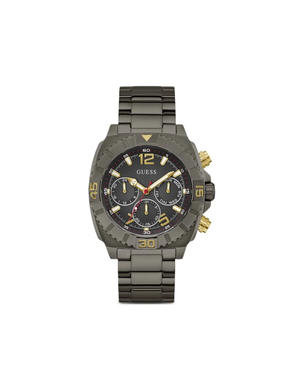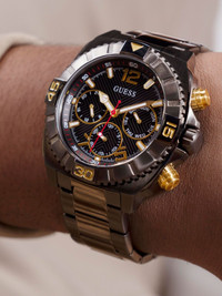 Traction 44mm Highlights - 44mm - Black - Stainless steel/recycled steel - Arabic dial - Arrow hands - Chronograph counters - Round face - Mineral glass - Count-up bezel - Centre-dent crown - Two chronograph pushers - Adjustable link bracelet - Folding clasp Imported Composition stainless steel 100%, Mineral Glass 100%, Recycled Steel 100% SIZE & FIT Measurement DIAMETER 1.73 in(4.4 cm)