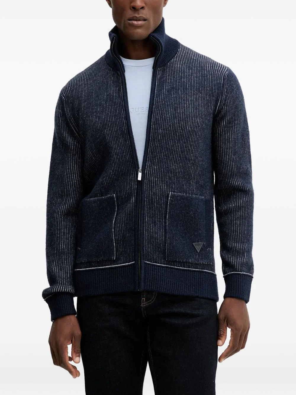 zip-up striped cardigan Highlights - Dark blue - Vertical stripe - Zip fastening - Two front pockets - Logo plaque Imported Composition Acrylic 43%, Polyester 30%, Polyamide 27% Washing instructions Read Manufacturer Guidelines