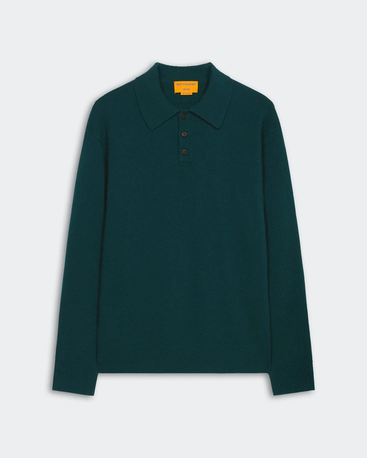 - Men's sizing, intended to fit true to size. - RIB POLO COLLAR - RIB CUFF AND HEM TRIM - THREE-BUTTON HALF PLACKET CLOSURE - Signature GIR branding at center back - Medium-weight - 100% Cashmere - Julia is 5' 9.5" / 177cm and is wearing a medium. - BRADLEY IS 6' 2.5" / 189 CM and is wearing a Medium. - Premium cashmere sourced from inner Mongolia, manufactured in China