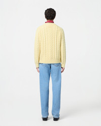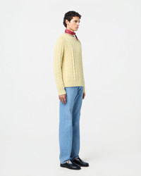 - Men’s cable knit sweater - HEAVY-WEIGHT - ARAN CABLE crew neck - RIB CUFF, HEM AND NECK TRIM - Signature gir branding at center back - 3 Gauge - 70% MERCERIZED WOOL, 30% CASHMERE - Ellemijn is 5' 8” / 177 CM and is wearing a size small. - BRADLEY IS 6' 2.5" / 189 CM and is wearing a size medium.