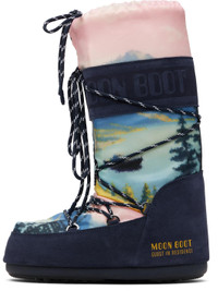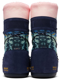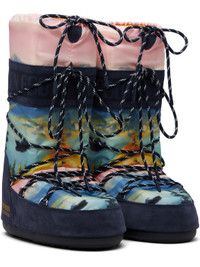 Mid-calf insulated canvas and suede boots. · Ambidextrous construction · Graphic printed throughout · Lace-up closure · Drawstring at padded collar · Logo printed at sides · Fleece lining · Lightweight rubber platform midsole · Treaded rubber sole · Platform: H2" Part of the Guest In Residence x Moon Boot collaboration. Supplier color: Midnight Upper: leather, textile. Sole: rubber. Made in Romania 261173M255005