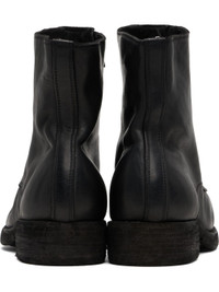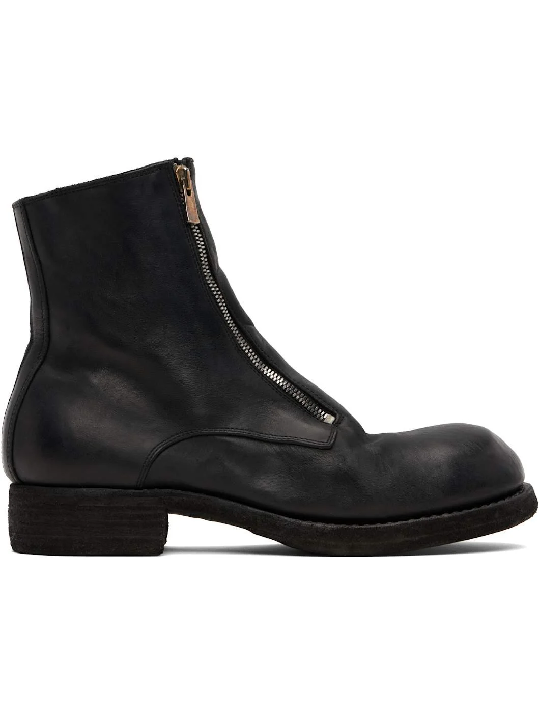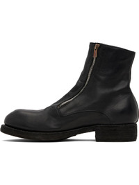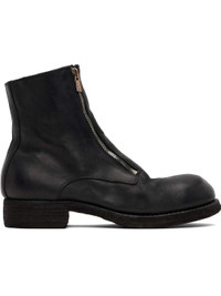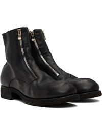 Ankle-high piece-dyed grained horse leather boots. · Twin zip closures at vamp · Full buffed leather lining · Topstitching at Goodyear welt · Stacked leather heel · Leather sole · Logo-engraved antiqued silver-tone hardware · Heel: H1.25" Supplier color: Black Upper: horse leather. Sole: leather. Made in Italy 251703M228002