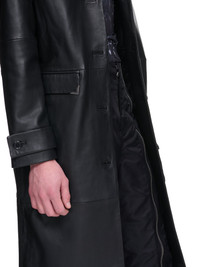 HAN KJØBENHAVN coat in black, leather construction, seam & metal detailing, single breasted, notched lapel collar, chest pockets, button closure, adjustable cuffs, side flap pockets, back vent, lined, mid-length, tailored fit, gender-neutral. Women's Italian Sizing Body - 100% Lamb Leather Lining - 100% Recycled Polyester Model is 6'1" wearing size 36. Shoulders: 20" Chest: 38" Waist: 30"