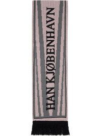 Knit acrylic scarf. · Intarsia logo pattern and stripes throughout · Fringed detailing at ends · L71" x W7" Supplier color: Dusty purple 100% acrylic. Made in China 252827M150000