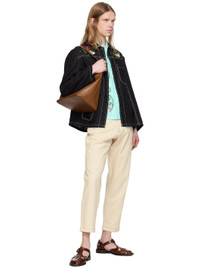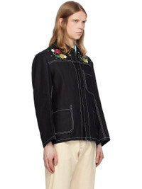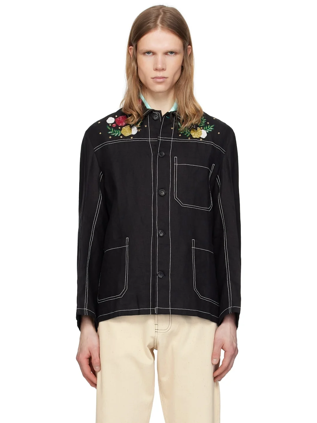 Hand-woven linen hopsack jacket. · Beaded floral appliques at spread collar and chest · Button closure · Patch pockets · Contrast stitching in white Supplier color: Black 100% linen. Made in India 251245M180000