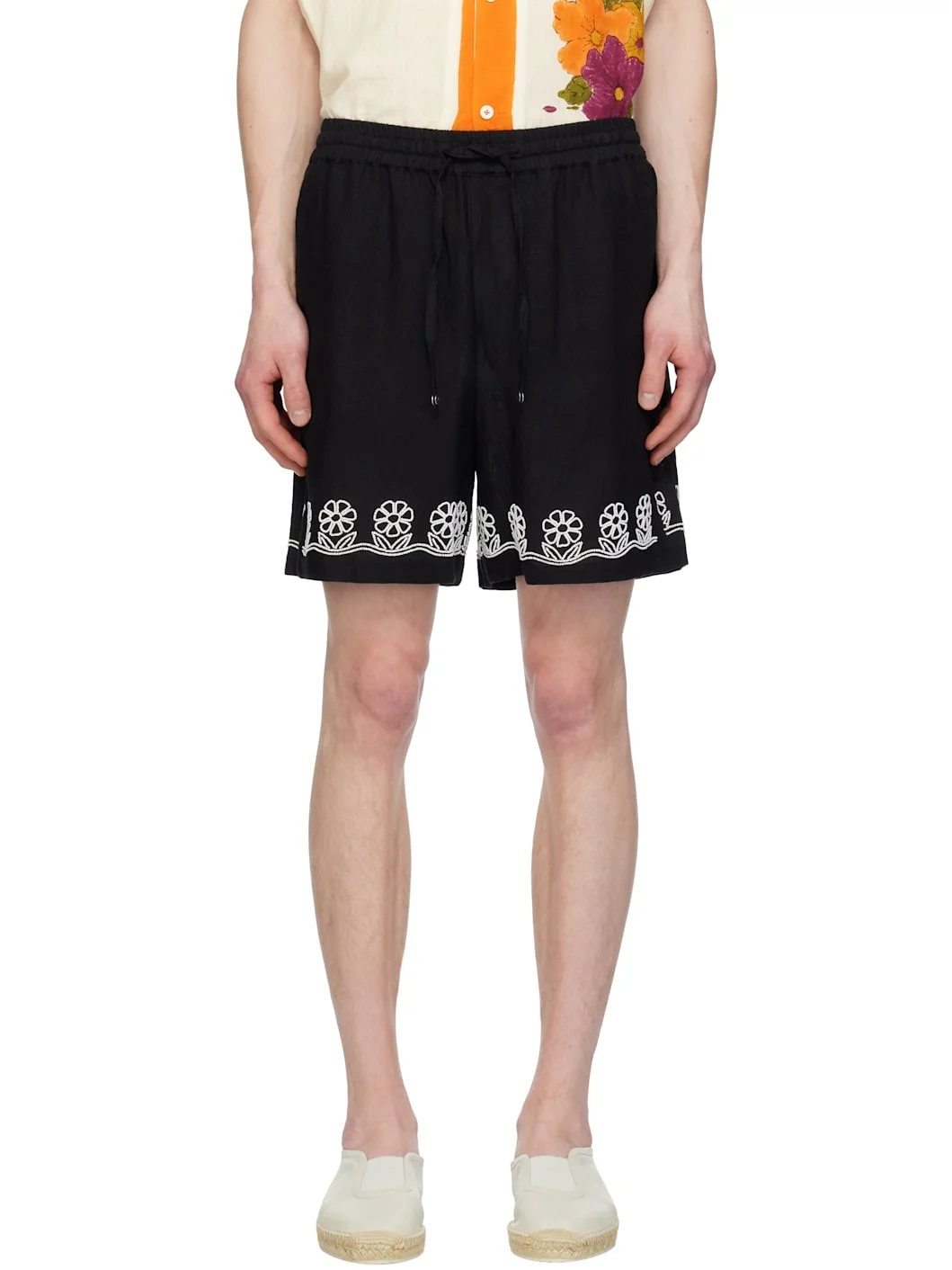 Hand-woven and hand-spun plain-woven linen shorts. · Drawstring at elasticized waistband · Three-pocket styling · Beaded floral pattern at hem Supplier color: Black 100% linen. Made in India 251245M193003