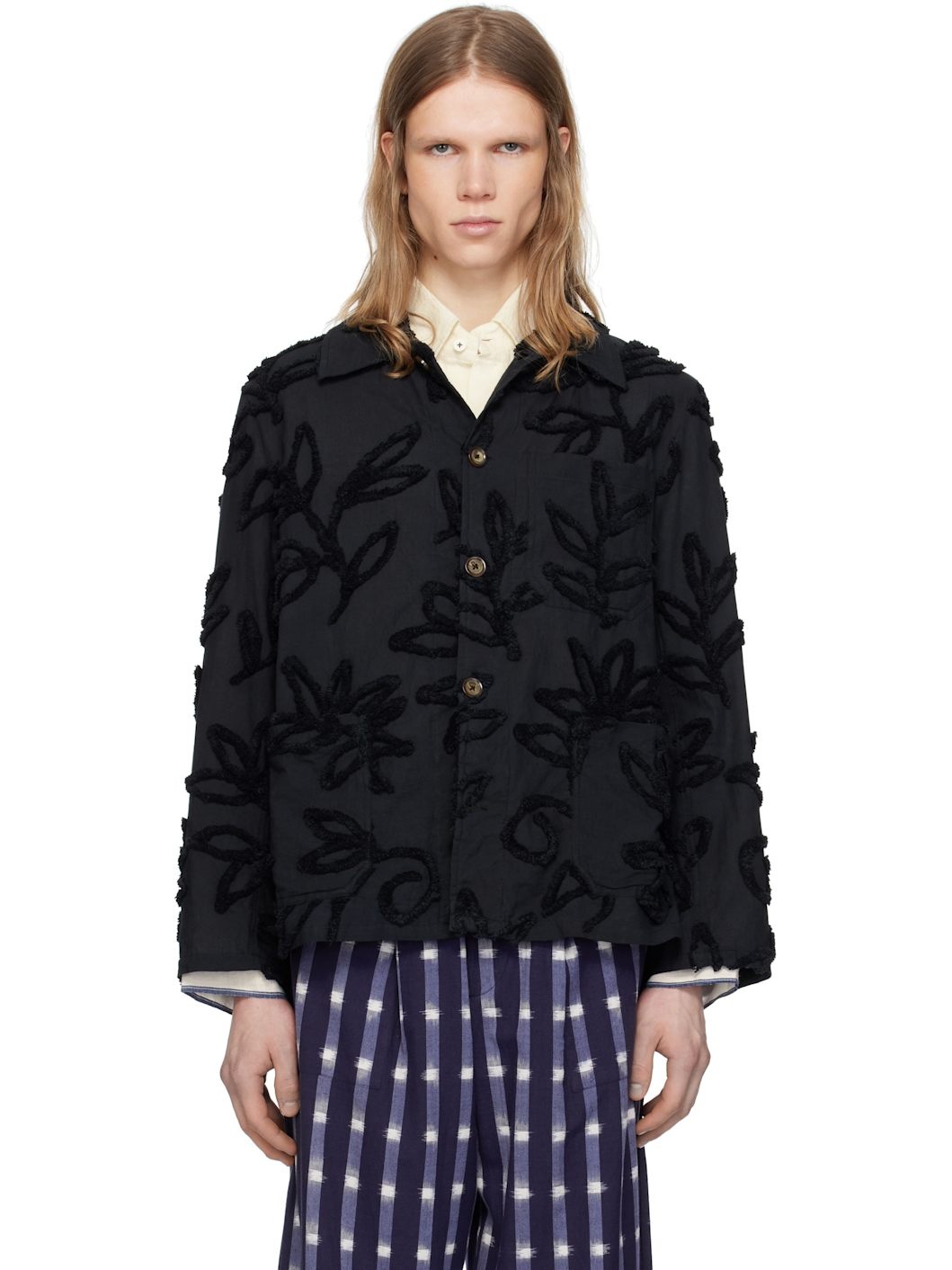 Hand-woven cotton jacket. Boucle floral pattern throughout. - Spread collar - Button closure - Patch pockets Supplier color: Black