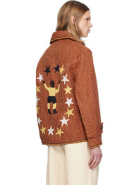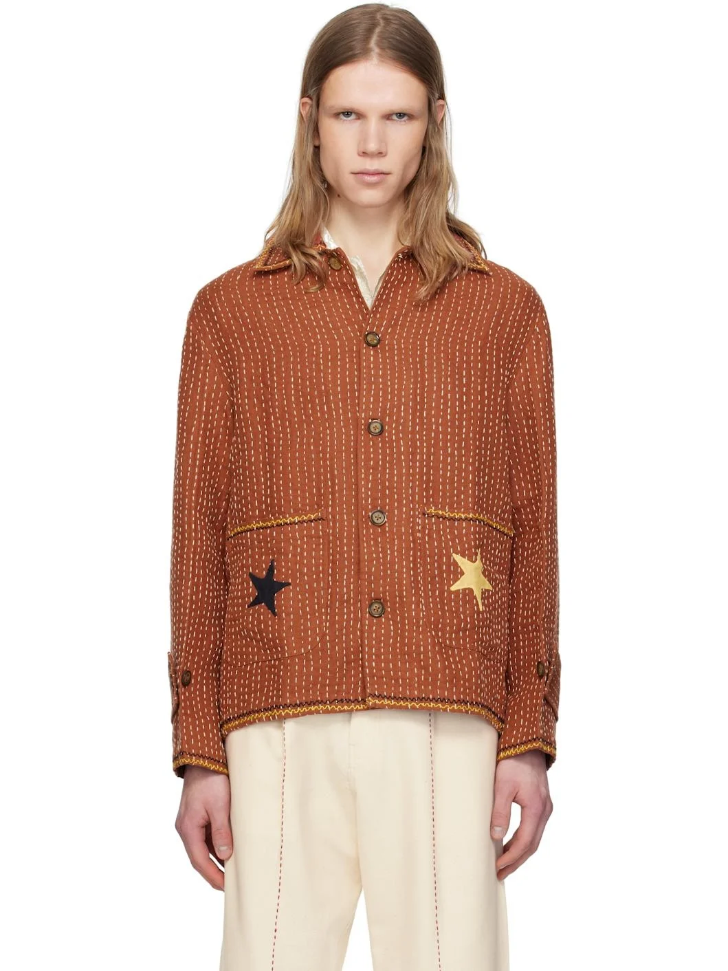 Hand-woven linen hopsack jacket. Stripes embroidered throughout. · Spread collar · Button closure · Graphic appliques at front and back · Patch pockets · Adjustable button tab at cuffs Supplier color: Brown 100% linen. Made in India 251245M180004