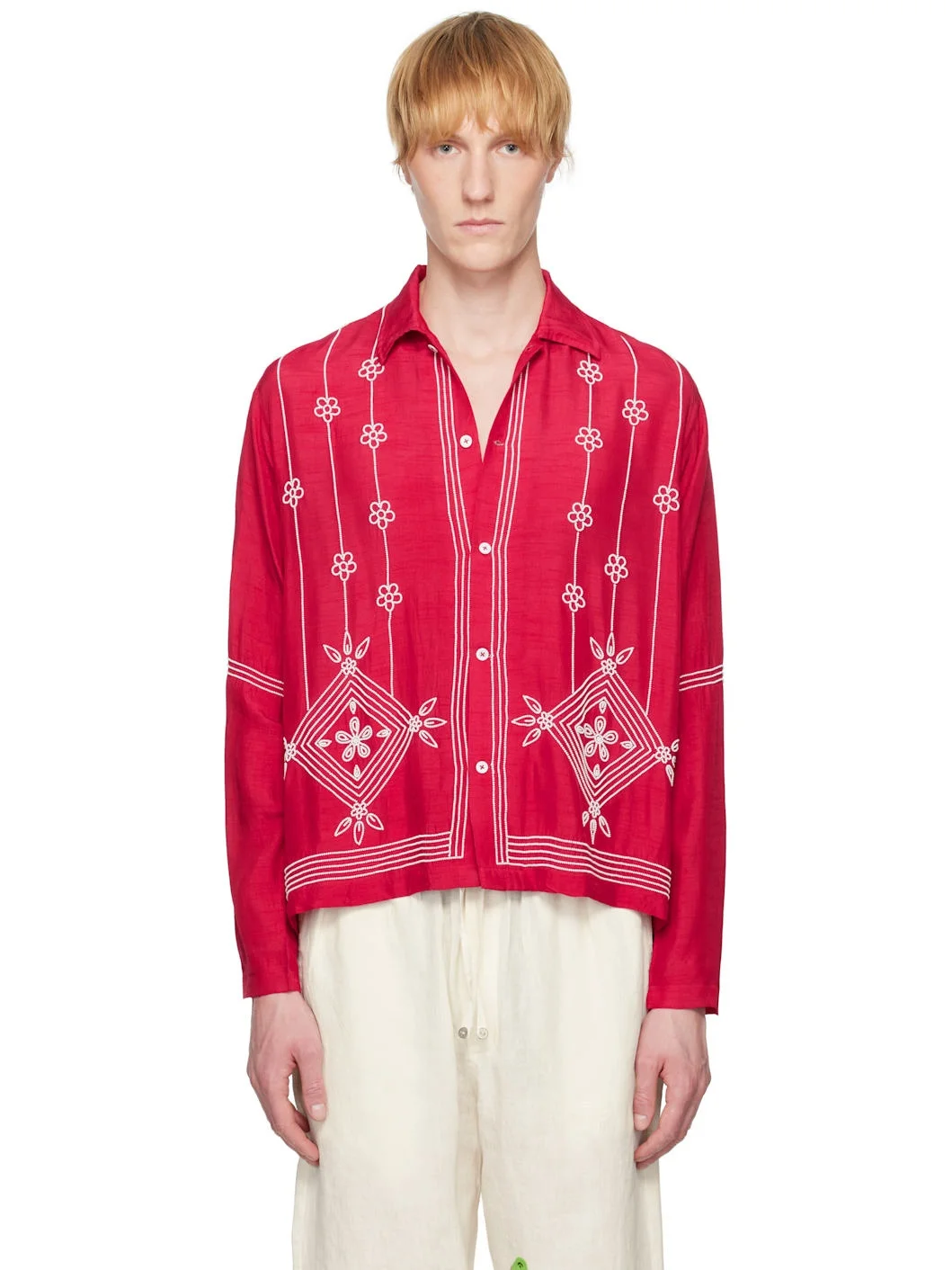 Handcrafted plain-woven slub silk shirt. Beaded floral pattern and stripes throughout. · Spread collar · Button closure Supplier color: Red 100% silk. Made in India 251245M192019