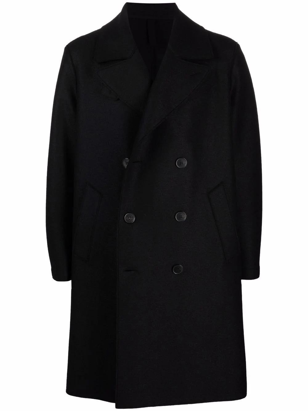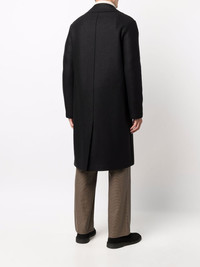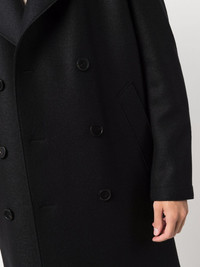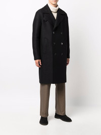 double-breasted tailored coat Highlights - Black - Virgin wool - Slim cut - Double-breasted button fastening - Classic lapels - Button fastening - Long sleeves - Mid-length Made in Italy Composition Virgin Wool 100% SIZE & FIT Model measurements Height 6 ft 1 in(1.86 m) Bust/Chest 35.43 in(90 cm) Hips 35.43 in(90 cm) Waist 29.92 in(76 cm) FittingInformation This piece fits true to size. We recommend you get your regular size Cut for a loose fit Made with a mid-weight fabric