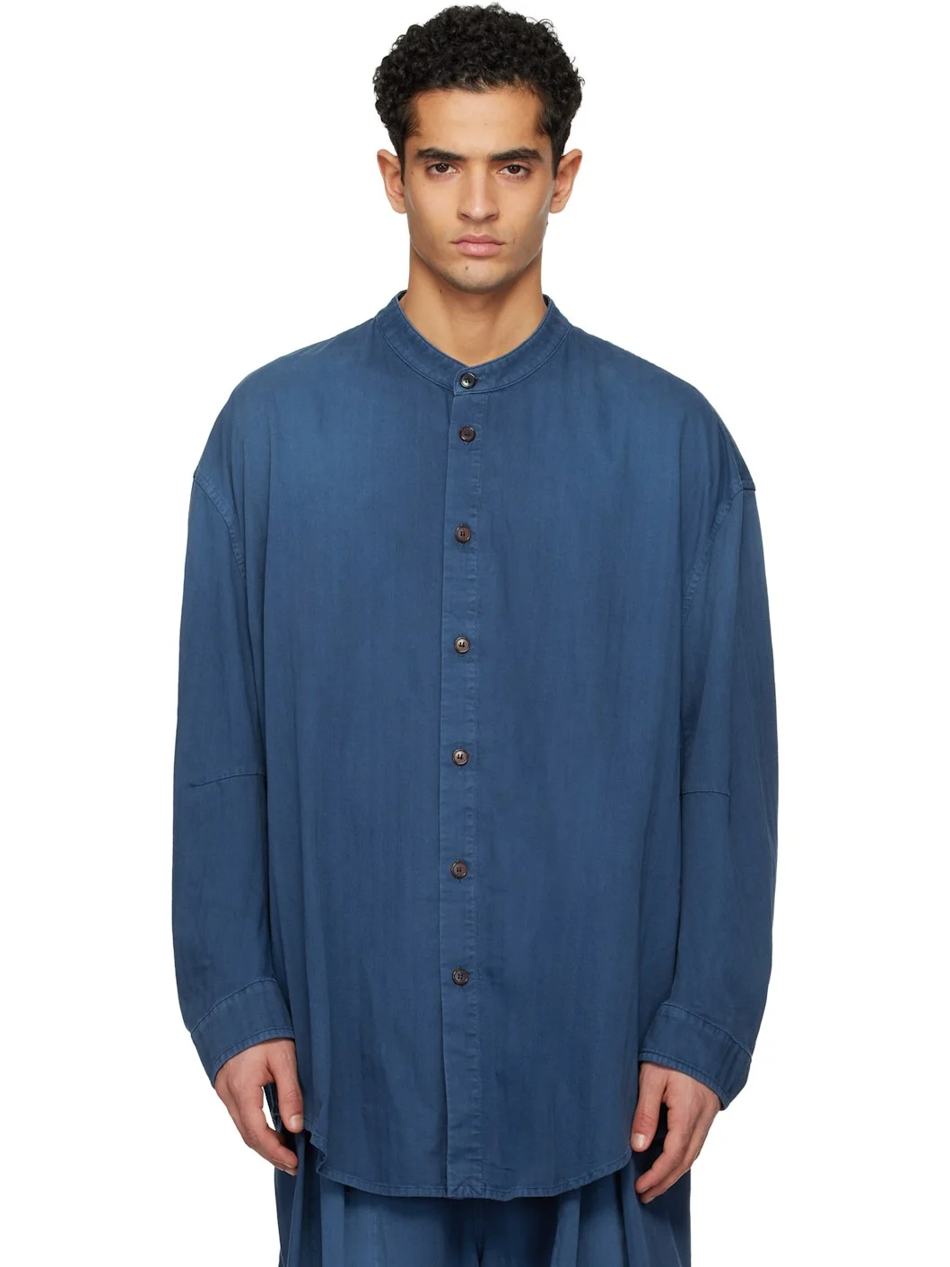 Non-stretch denim shirt. · Herringbone pattern throughout · Band collar · Button closure · Shirttail hem · Dropped shoulders · Dart at elbows · Barrel cuffs · Embroidered logo and box pleat at back yoke Supplier color: Blue 100% cotton. Made in Italy 261897M192011