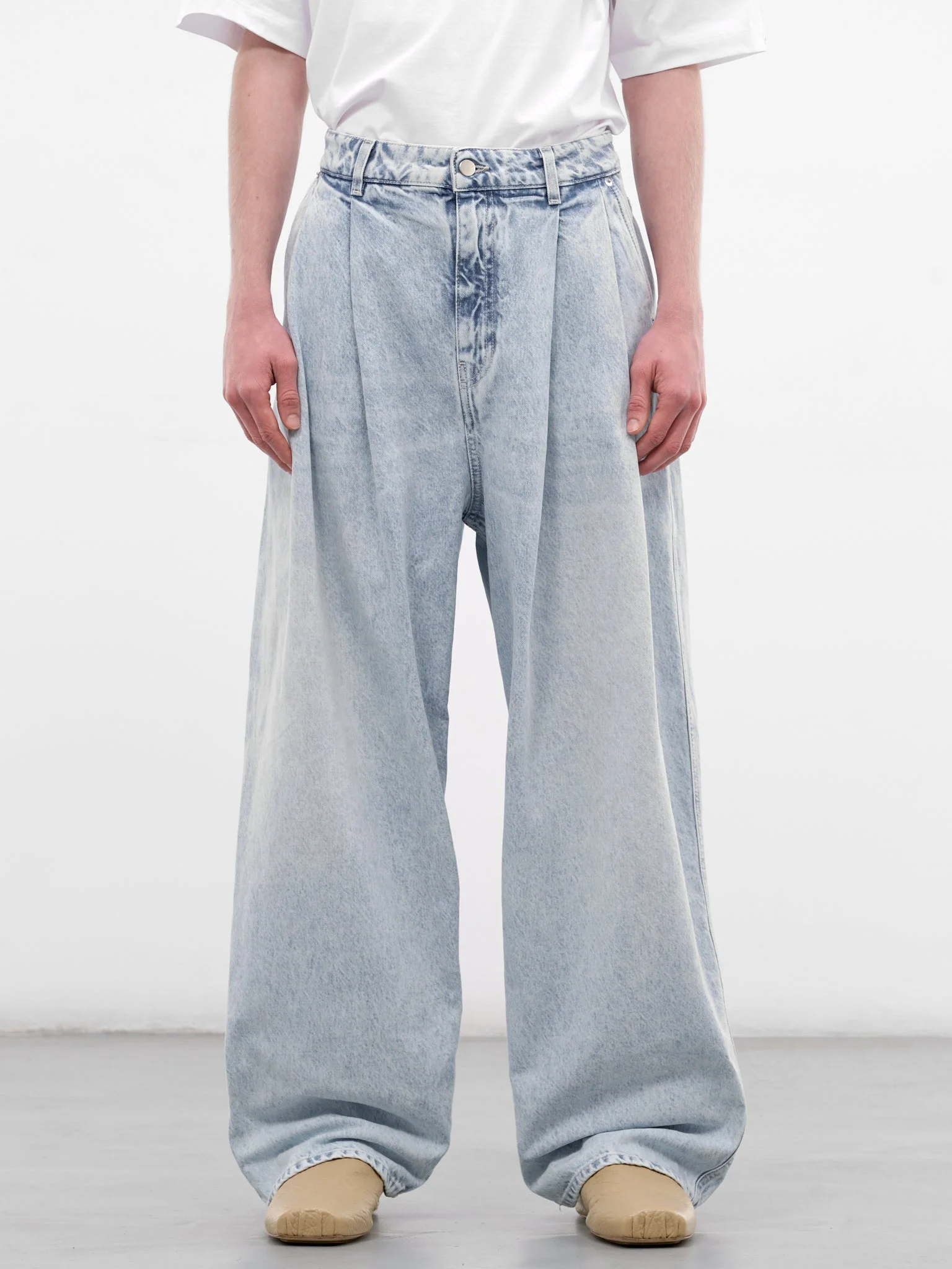 Light blue denim jeans with heavy fading and pleated construction. Featuring: • Baggy fit • Wide leg • Heavy fading • Belt loops • Back logo patch • Front button and zip fly closure • Pleated • Four-pocket styling • Made in Italy • 100% Cotton • Standard sizing Model is 6'0" wearing size M. Shoulders: 19" Chest: 35" Waist: 28"