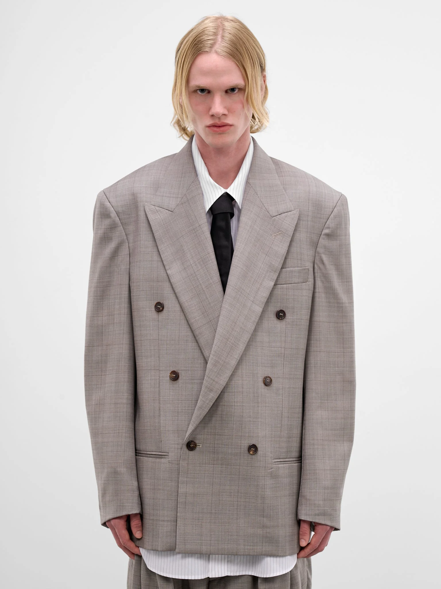 Gray virgin wool blazer with glen check pattern and peaked lapel. Featuring: • Oversized fit • Glen check pattern • Peaked lapel • Structured shoulders • Long sleeves • Surgeon's cuffs • Double-breasted button closure • Chest welt pocket • Side welt pockets • Made in Italy • 100% Virgin Wool • Standard sizing Model is 6'0" wearing size M. Shoulders: 19" Chest: 35" Waist: 28"