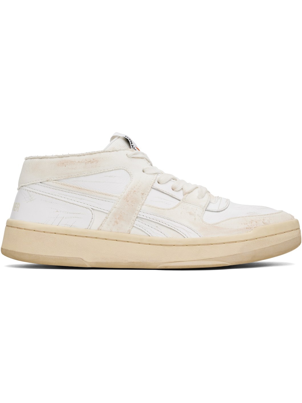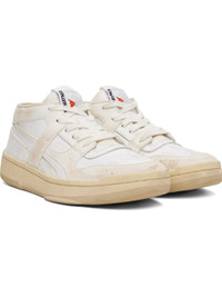 High-top grained leather and canvas sneakers in off-white. · Distressing and smudging throughout · Lace-up closure · Logo patch at padded tongue · Padded collar · Logo applique at sides · Logo printed at heel counter · Buffed leather lining · Treaded rubber sole Part of the Hed Mayner x Reebok Classics collaboration. Supplier color: Mixed white Upper: textile, leather. Sole: rubber. Made in Viet Nam 251897M236001