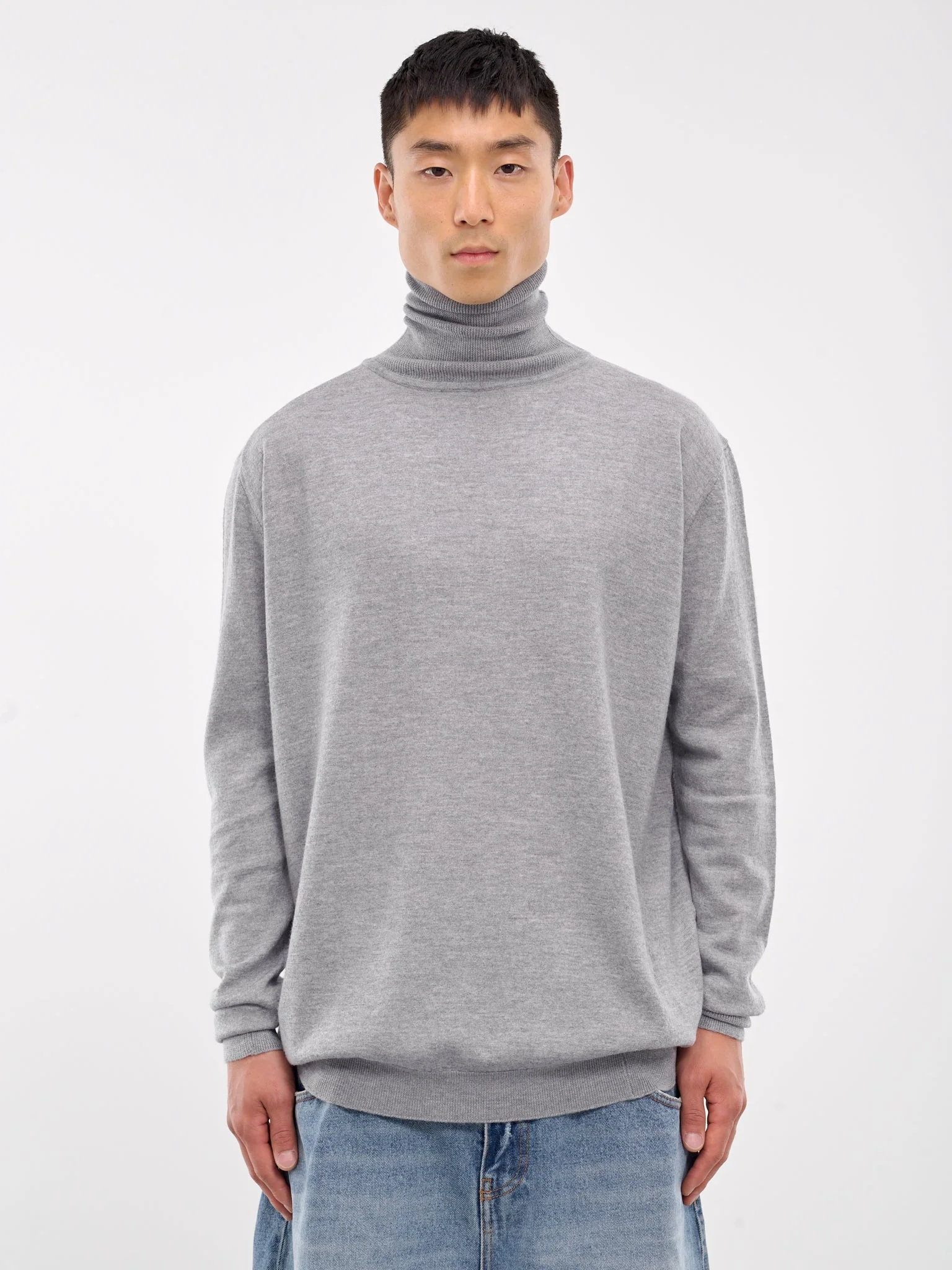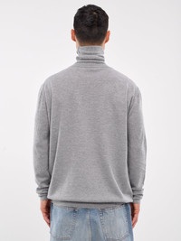 HED MAYNER turtleneck in grey, paneled knit construction, ribbed turtleneck, long sleeves, rib-knit cuffs & hem, straight hem, relaxed fit. Standard Sizing Model is 6'1" wearing size M. Shoulders: 18" Chest: 36" Waist: 28"
