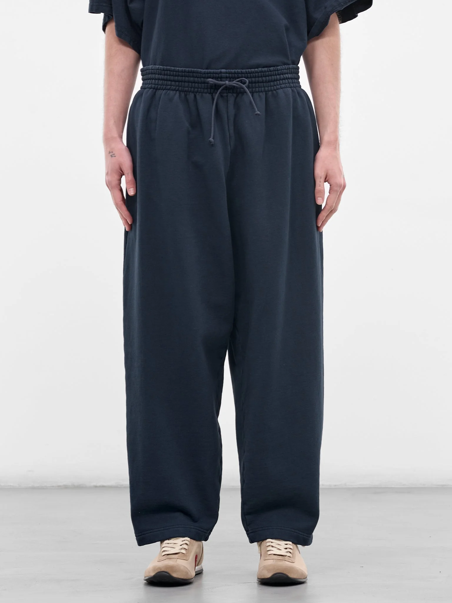 Navy sweatpants in cotton shaped with a wide leg and elasticated waistband with drawstring. Featuring: • Baggy fit • Elasticated waistband with drawstring • Side pockets • Back welt pocket • Wide leg • Made in Italy • 100% Cotton • Standard sizing Model is 6'0" wearing size M. Shoulders: 17.5" Chest: 34.5" Waist: 29"