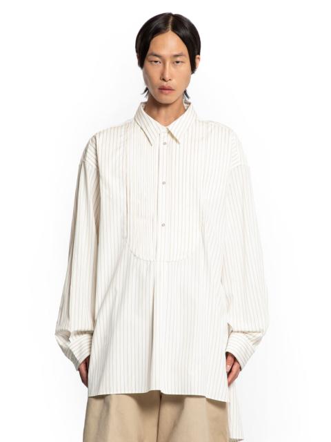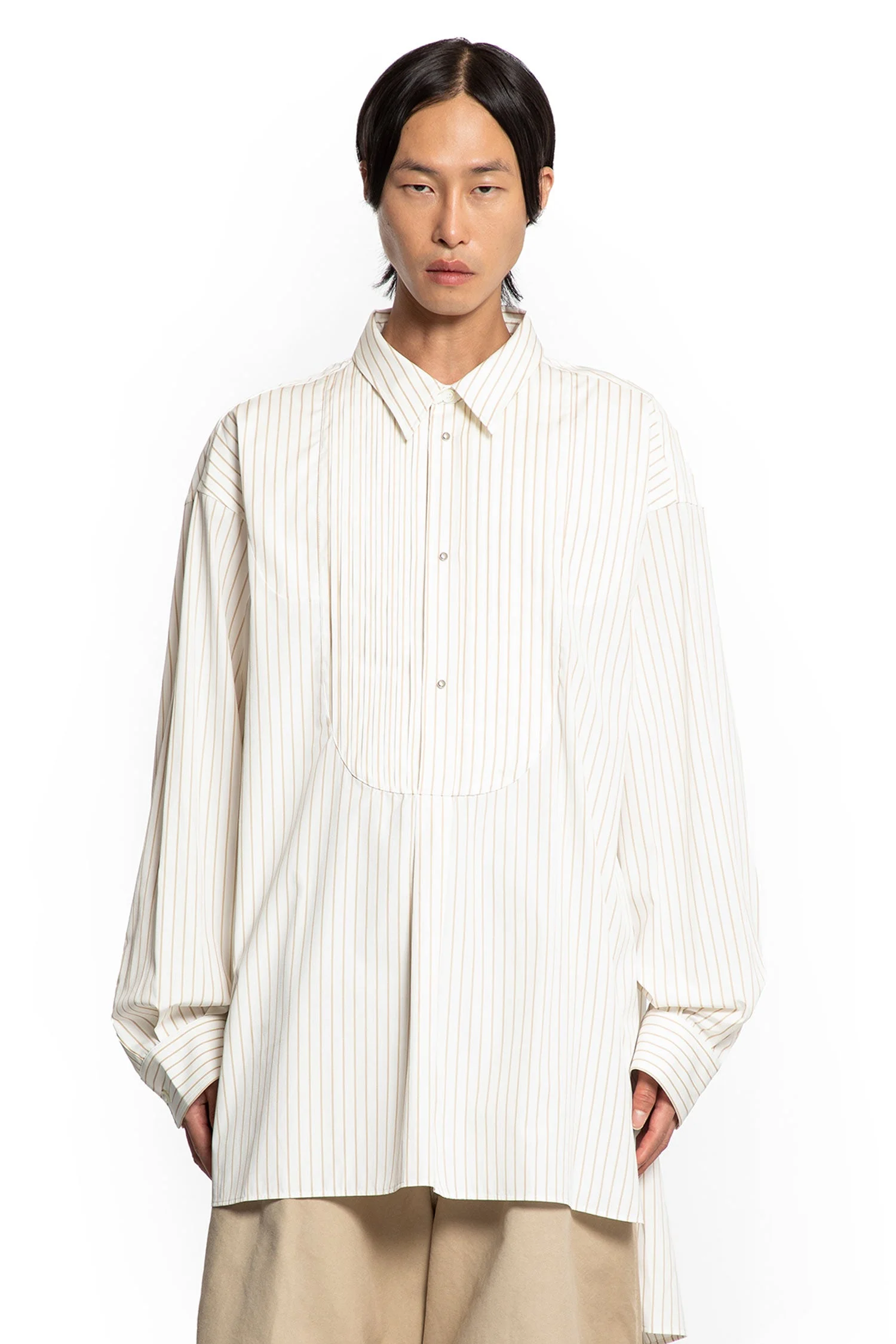 DESCRIPTION - Runway style - Natural - Pinstriped - Classic collar - Button closure - Front bib - Dropped shoulders - Long sleeves - Buttoned cuffs - Side splits - Dropped back - Back box pleat - Oversized fit DETAILS - Made in: Italy - Composition: 100% Cotton - Model code: HMMB60026RHB125 102 - Item ID: 9720534303062 SIZE & FIT Model wears size S Model Height 188 cm Bust 88 cm Waist 69 cm Hips 88 cm
