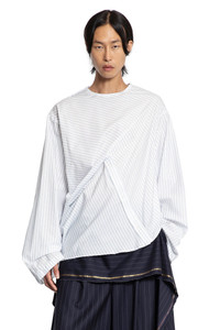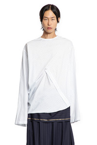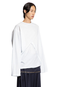 DESCRIPTION - Runway style - Multicolor - White/blue - Pinstriped - Round neck - Front twist with button placket - Dropped shoulders - Long sleeves - Draped back - Asymmetric hem - Relaxed boxy fit DETAILS - Made in: Italy - Composition: 100% Cotton - Model code: HMMB65020AHB049 104 - Item ID: 9720534958422 SIZE & FIT Model wears size S Model Height 188 cm Bust 88 cm Waist 69 cm Hips 88 cm