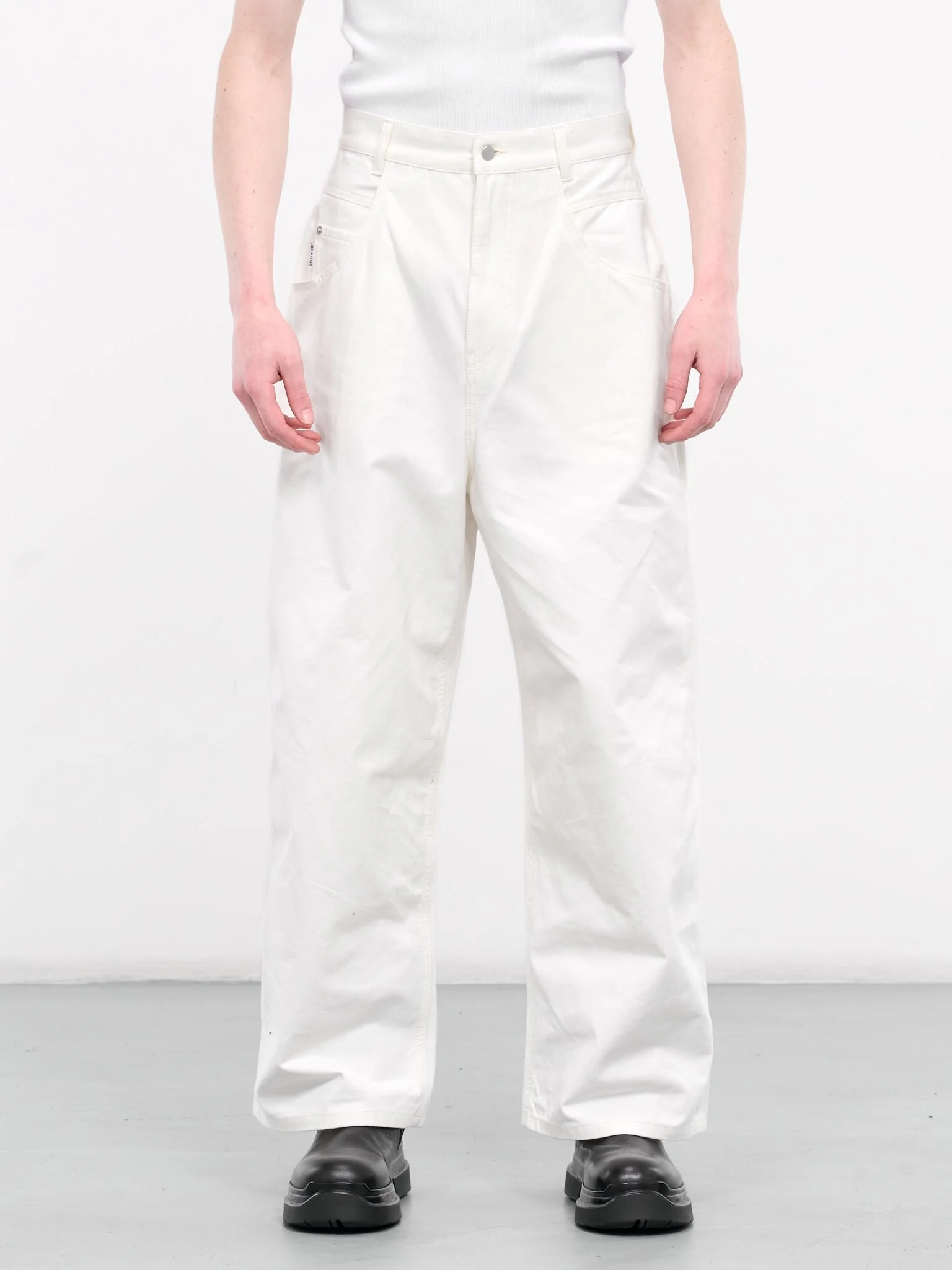 HED MAYNER pants in white, paneled cotton construction, belt loops, back logo patch, front button & concealed zip fly closure, inset pockets, coin pocket & logo flag, back patch pockets, wide leg, loose fit. Made in Italy 100% Cotton Standard Sizing Model is 6'1" wearing size M. Shoulders: 18" Chest: 17.5" Waist: 30"