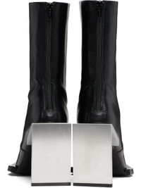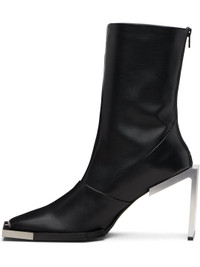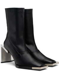 Handcrafted ankle-high buffed calfskin boots. · Logo plaque at square toe · Zip closure at heel · Bonded jersey lining · Brushed stainless steel heel with rubber injection · Leather sole · Heel: H4" Supplier color: Black Upper: calfskin. Sole: leather, rubber. Made in Portugal 252295M228000