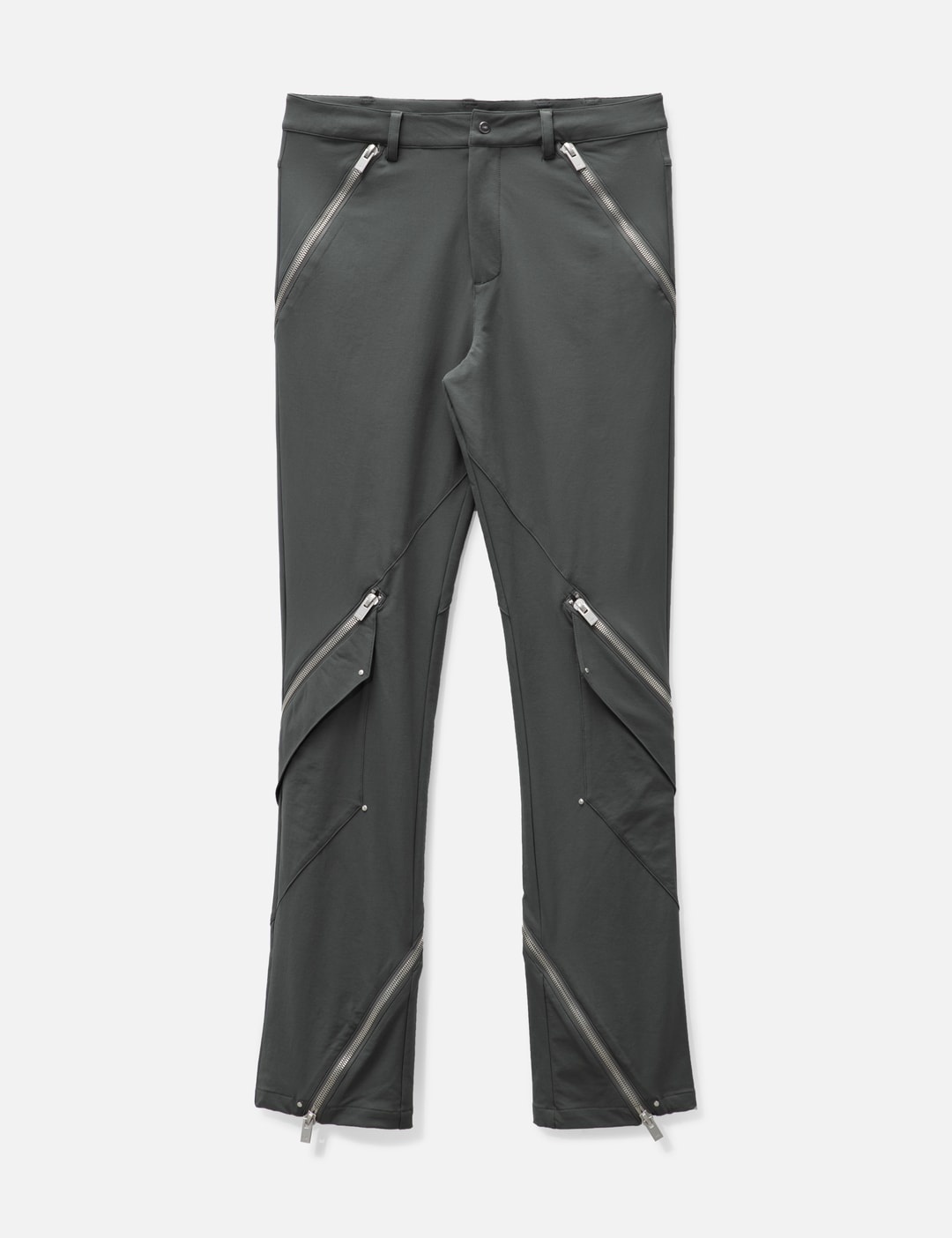 - Heliot Emil - Frazil Cargo Trouser - Regular fit - Stretch Cordura fabric - Zip fly with press button closure - Angled patch pockets at front legs - Zip detailing throughout - Metal studs all over - 'H'-belt loop at back - Color: Dark Gray - Material: 94% Nylon, 6% Polyurethane - See more Pants and Clothing SIZING - Model wears size 48 - Model measures: Height 189cm, Chest 32”/81cm, Waist 27”/69cm, Hip 35.5”/90cm