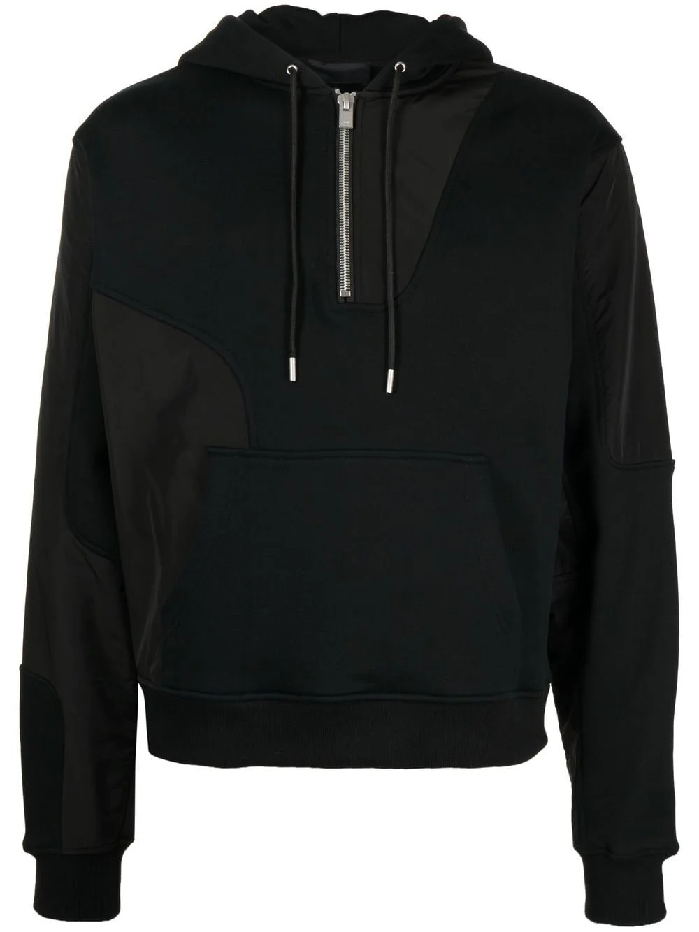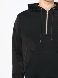 half-zip cotton sweatshirt black cotton jersey knit panelled design drawstring hood elasticated cuffs elasticated hem half front zip fastening long sleeves front pouch pocket Imported Composition Cotton 100% SIZE & FIT Model measurements Height 6 ft 2 in(1.87 m) Bust/Chest 34.25 in(87 cm) Hips 36.22 in(92 cm) Waist 29.52 in(75 cm) FittingInformation This piece fits true to size. We recommend you get your regular size Cut for a loose fit Made with a mid-weight fabric Washing instructions Machine Wash
