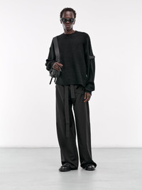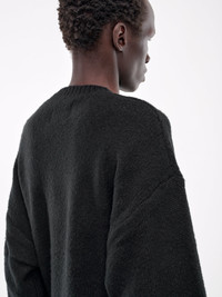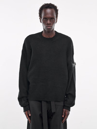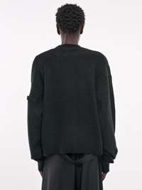 HELIOT EMIL sweater in black, wool-cashmere blend, paneled knit construction, ribbed crewneck, long sleeves, sleeve straps, rib-knit cuffs & hem, relaxed fit. 57% Merino Wool 25% Cashmere 18% Recycled Nylon Standard Sizing Model is 5'11.5" wearing size M. Shoulders: 16" Chest: 32.5" Waist: 30"