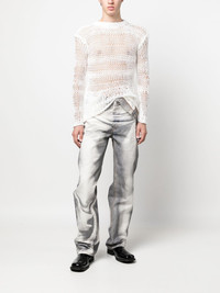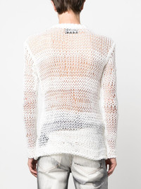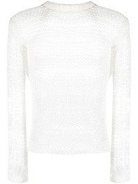 open-knit crew-neck jumper off-white wool blend open knit semi-sheer construction crew neck long sleeves Made in Italy Composition Wool 65%, Microfibre 35% SIZE & FIT Model measurements Height 6 ft 2 in(1.87 m) Bust/Chest 36.41 in(92.5 cm) Hips 37 in(94 cm) Waist 29.52 in(75 cm) FittingInformation This piece fits true to size. We recommend you get your regular size Cut for a slim fit Made with a mid-weight fabric Washing instructions Dry Clean Only