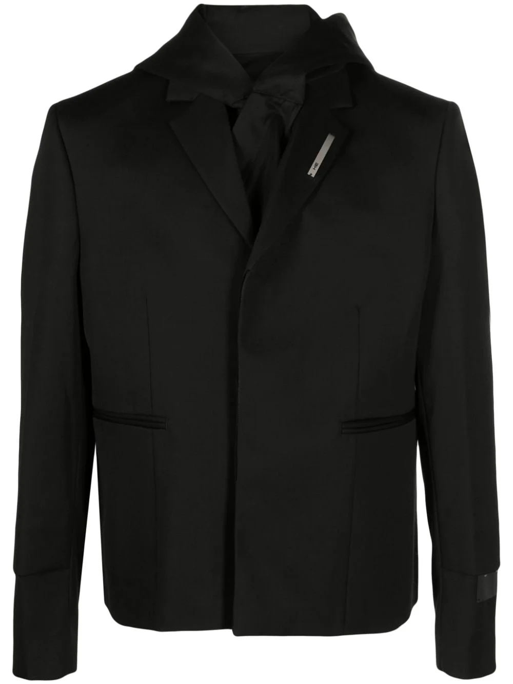 single-breasted hooded blazer Highlights - Black - Virgin wool - Satin trim - Dart detailing - Silver-tone logo plaque - Detachable hood - Notched lapels - Concealed front fastening - Long sleeves - Buttoned cuffs - Two front jetted pockets - Italian rear vents Imported Composition Outer: Virgin Wool 100% Lining: Viscose 50%, Acetate 50% SIZE & FIT Model measurements Height 6 ft 2 in(1.87 m) Bust/Chest 36.61 in(93 cm) Hips 35.03 in(89 cm) Waist 27.95 in(71 cm) FittingInformation Designed for a boxy fit, intended for a loose fit throughout The detachable panel offers the preference for a different fit Made from a midweight non-stretch fabric This piece fits true to size – take your usual size Washing instructions Dry Clean Only