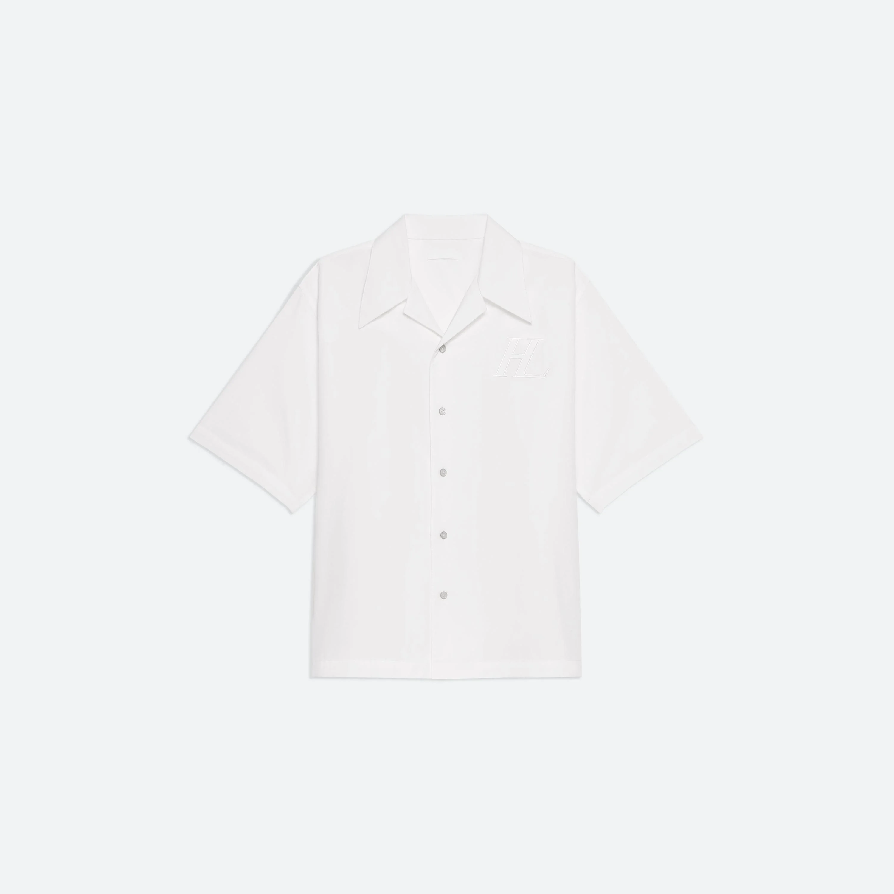 Boxy short-sleeved shirt in soft cotton poplin with embroidered logo outline. Fits true to size. Model is 6’3” and wears size M. DETAILS - Camp collar - Button-front closure - Embroidered HL logo at chest - Side vents - Metal-wrapped logo buttons - Relaxed fit - P05HM504 MATERIALS & CARE - Composition: 100% cotton - Professional dry clean only. - Finished Garment Manufacturing Country/Region: China - Fabric Production Country/Region: Japan - Weaving Country/Region: (of fabric) Japan - Dyeing Country/Region: (of fabric) Japan - Finishing Country/Region: (of fabric) Japan