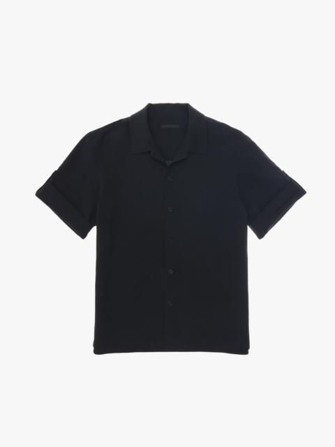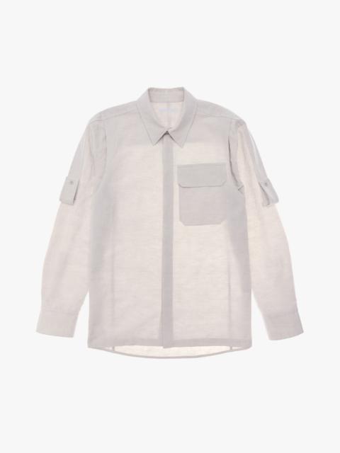 The Helmut Lang Shirt is a straight-cut style in cotton-linen with a pointed collar, extended shoulder epaulets, front cargo pocket, covered button front closures, and rolled button tab short sleeves with an embroidered HL logo. DETAILS - 54% Cotton, 46% Linen - Pointed collar - Long sleeves - Extended shoulder epaulettes - Button front closures - Button roll tab details - Imported - N04HM501 CARE - Professional dry clean only FIT - Fits true to size - Zhang is 6’2” and is wearing size M
