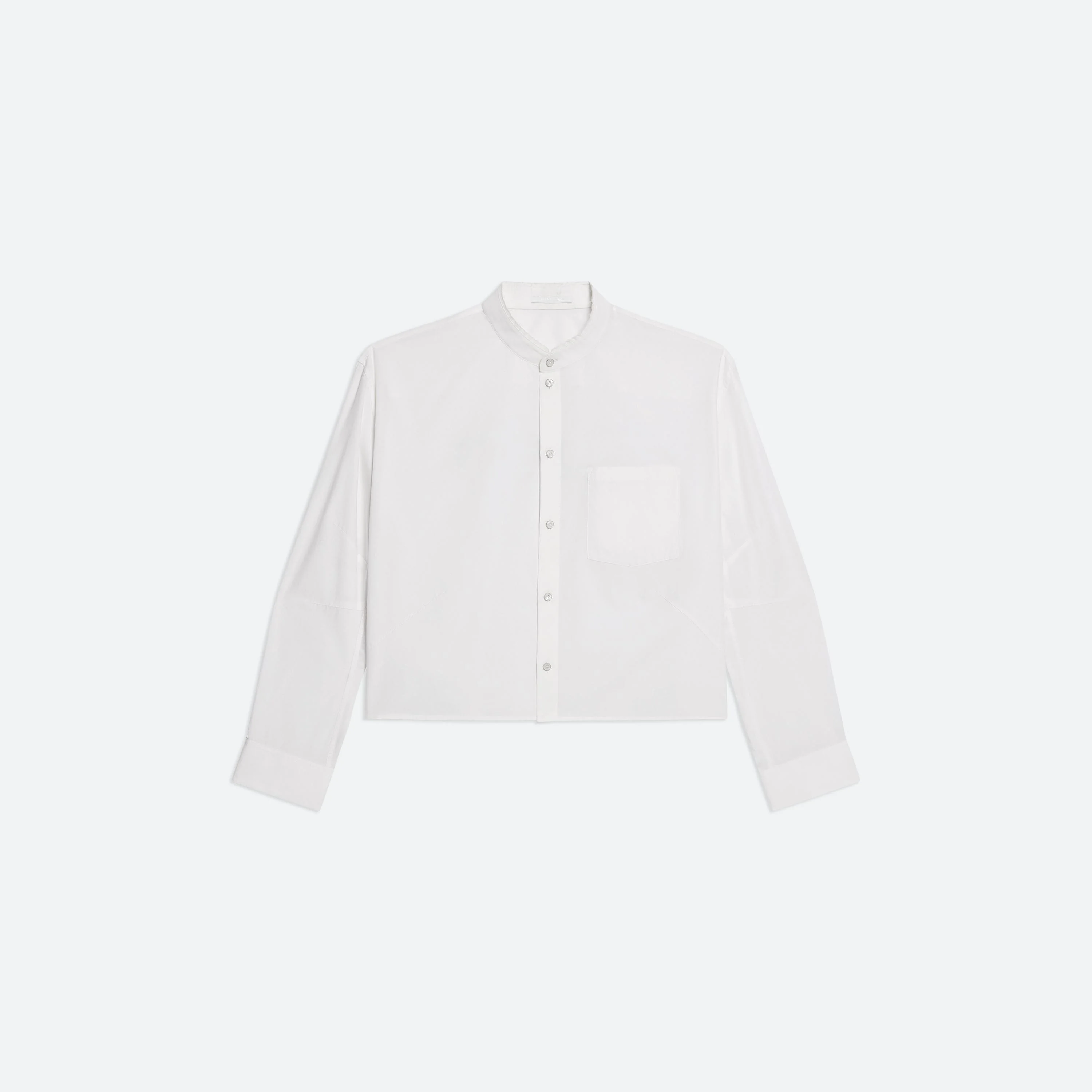 Oversized button-front shirt in cotton poplin with a cropped fit and cut-off collar. Curved seams wrap around the body, emphasizing the relaxed shape. Fits true to size. Model is 6'1” and wears size M. DETAILS - Cut-off collar with raw edge - Patch pocket - Long sleeves - Button front closure and cuffs - Glossy logo text on back - Cropped length - Oversized fit - O09HM511 MATERIALS & CARE - Composition: 100% Cotton - Professional dry clean only. Do not iron on logo. - Finished Garment Manufacturing Country/Region: China - Fabric Production Country/Region: Japan - Weaving Country/Region: (of fabric) Japan - Dyeing Country/Region: (of fabric) Japan - Finishing Country/Region: (of fabric) Japan