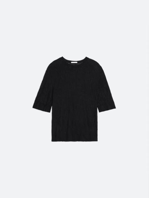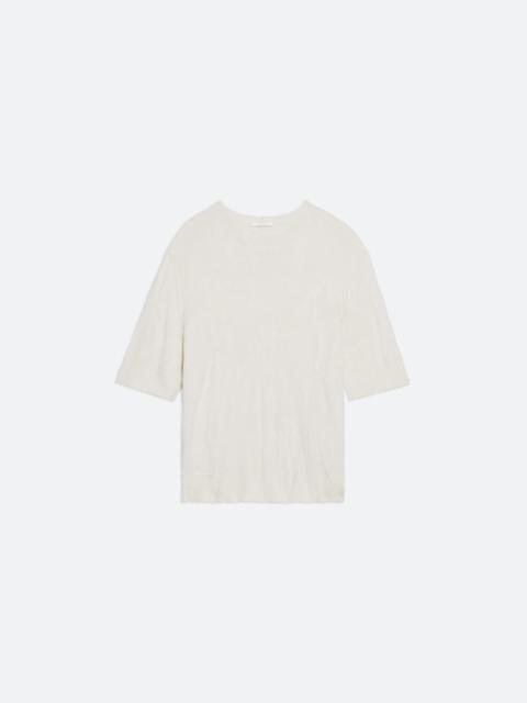 Fine gauge relaxed tee with the HELMUT LANG logo intarsia on back. The crush textured is formed by a special heat treatment executed by hand. Male Model is 6’2” and is wearing size M DETAILS - Crewneck - Short sleeves - Intarsia logo on back - Rib knit trim details - Crushed texture formed by special heat treatment - Female model is wearing men's S for an oversized fit - O02HM701 MATERIALS & CARE - Composition: 67% Merino Wool, 25% Polyurethane, 8% Polyester - Dry clean, Normal cycle, any solvent except trichloroethylene - Finished Garment Manufacturing Country/Region: China - Fabric Production Country/Region: Italy - Dyeing Country/Region: (of fabric) Italy - Finishing Country/Region: (of fabric) Italy - Spinning: (of fabric) Italy