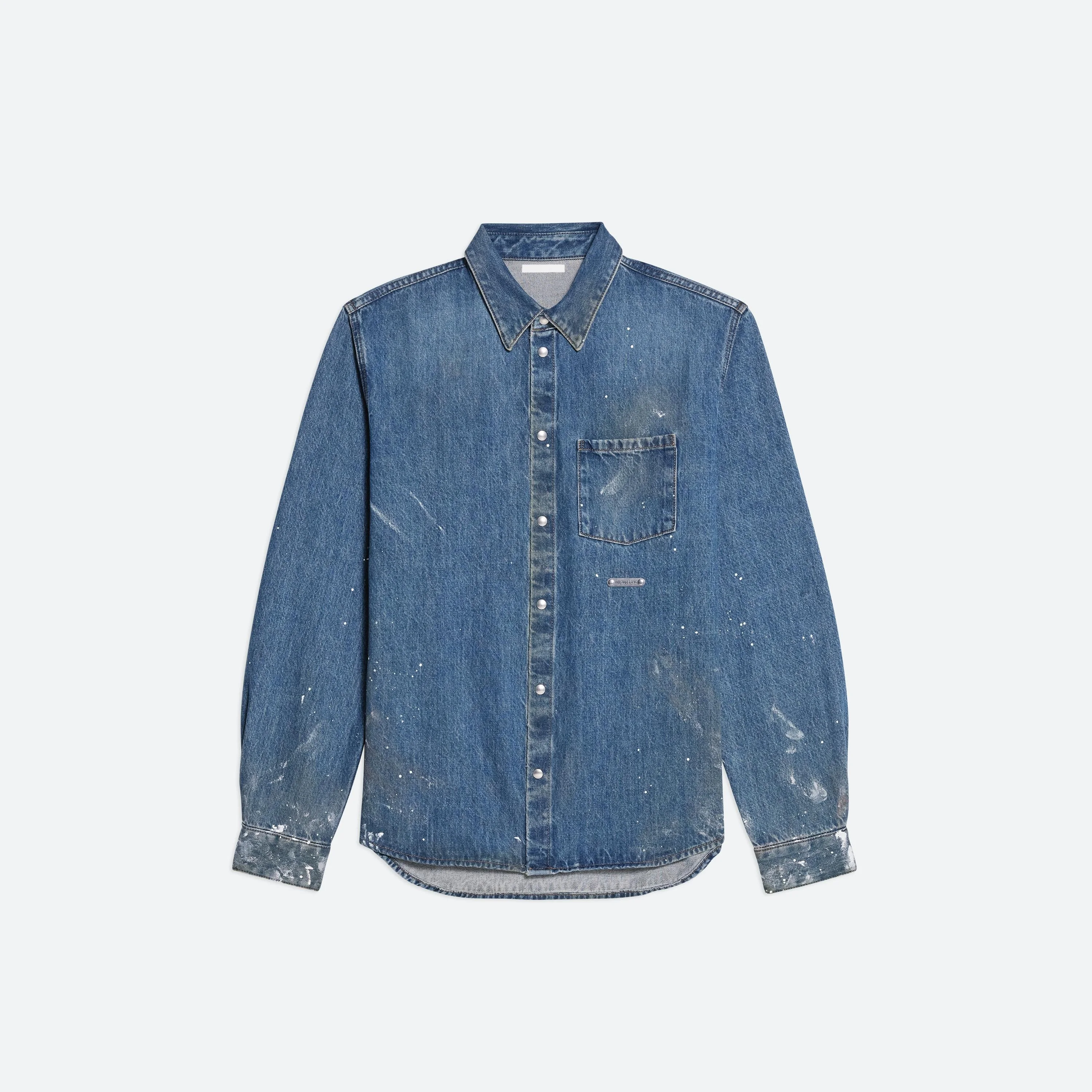 Classic shirt with snap closures in mid-wash cotton denim. Each shirt is finished by hand with paint and oil staining for a one-of-a-kind patina. Fits true to size. Model is 6’1” and is wearing size 40 DETAILS - Pointed collar - Patch pocket - Hand-painted detailing - Snap front closure and cuffs - Mid-wash cotton denim with classic finishes - Shirttail hem - Oversized fit - Riveted metal logo plate at back - O04DM103 MATERIALS & CARE - Composition: 100% Cotton - Machine wash cold with like colors. Do not bleach. Do not tumble dry. - Lay flat to dry. Cool iron if needed. Do not dry clean. - Finished Garment Manufacturing Country/Region: China - Fabric Production Country/Region: Italy - Weaving Country/Region: (of fabric) Italy - Dyeing Country/Region: (of fabric) Italy - Finishing Country/Region: (of fabric) Italy