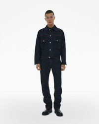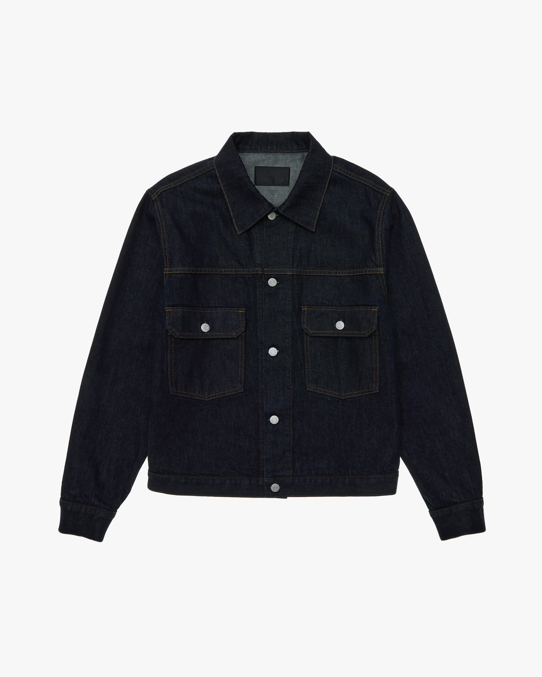 The Helmut Lang Trucker Jacket is a relaxed style in rigid denim with a pointed collar, front flap pockets, and button closures. DETAILS - 100% Cotton - Point collar - Button front closures - Front flap pockets - Long sleeves - Imported - N01DM101 CARE - Machine wash cold with like colors - Do not bleach, tumble dry, dry clean, iron print or patches - Lay flat to dry - Cool iron if needed FIT - Fits true to size - Ryan is 6’2” and is wearing size M