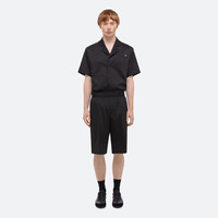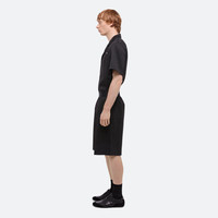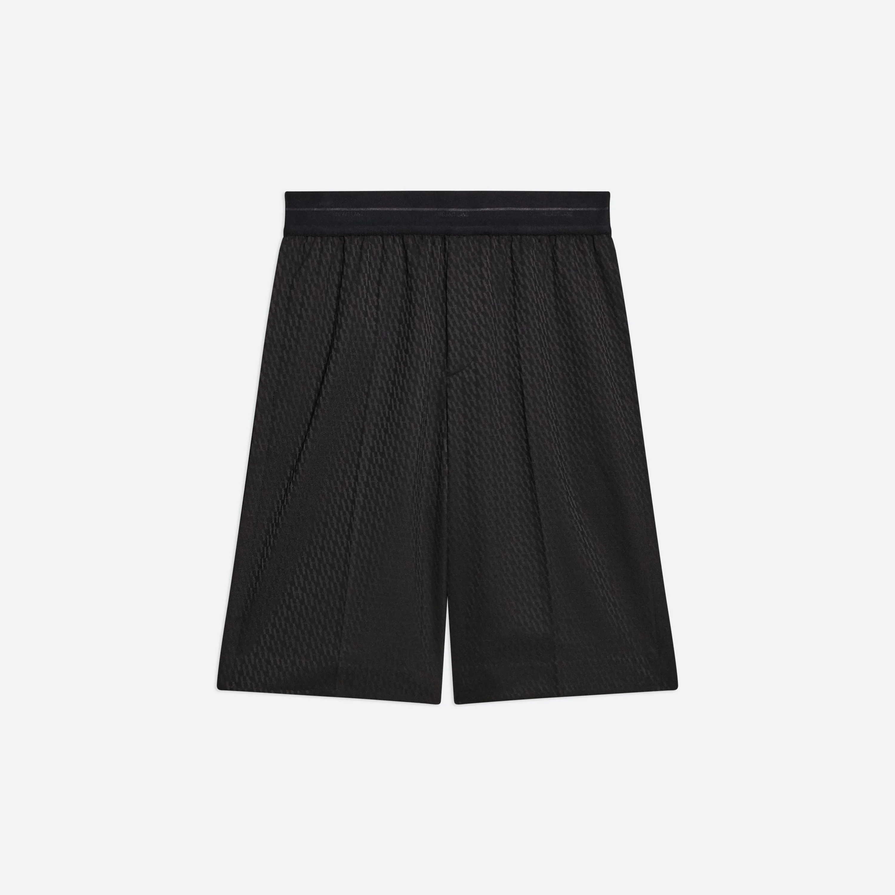 Tailored car shorts in satin logo jacquard, with a straight leg cut and hidden side pockets. Matches the Oversized Pajama Shirt and Modest Jacquard Shirt . Fits true to size. Model is 6'1” and wears size 32. DETAILS - Flat knit waistband - Flange along side seams - Slip pockets on sides - Patch pockets on back with metal logo clip - Faux zip fly - 12” inseam and 25 1/4” leg opening - O10HM205 MATERIALS & CARE - Composition: 73% Polyester, 25% Wool, 2% Elastane - Professional dry clean only. - Finished Garment Manufacturing Country/Region: China - Fabric Production Country/Region: Turkey - Weaving Country/Region: (of fabric) Turkey - Dyeing Country/Region: (of fabric) Turkey - Finishing Country/Region: (of fabric) Turkey