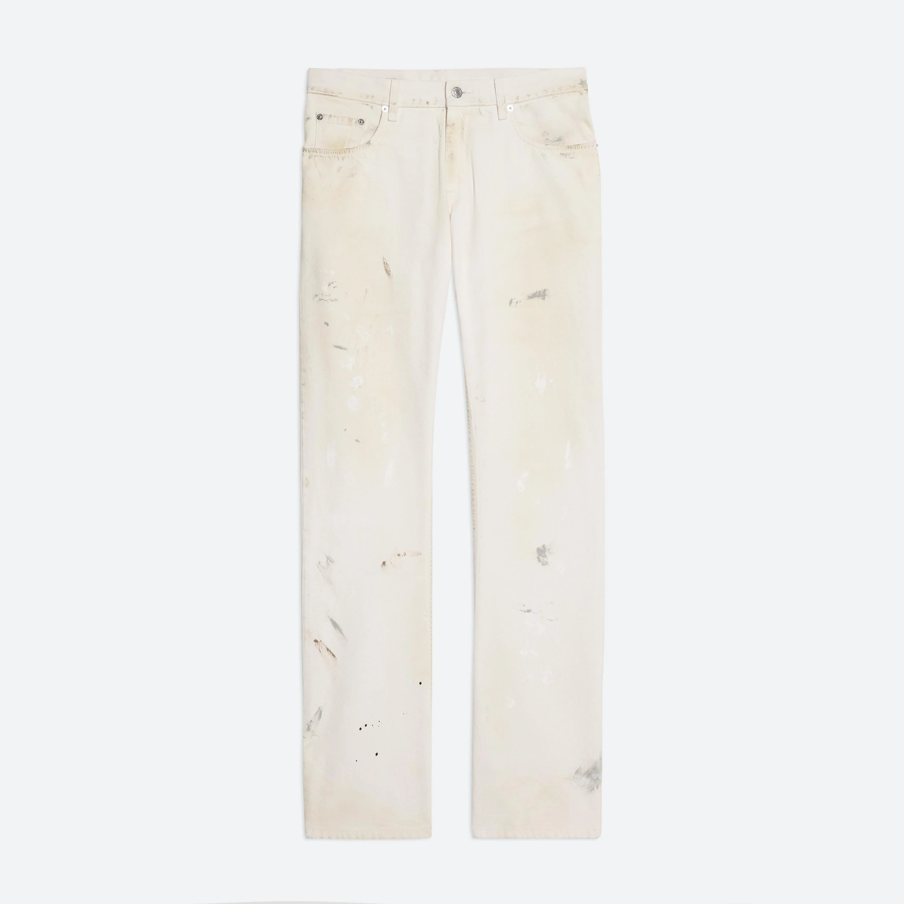Low-rise five-pocket jeans in undyed denim. Cut with an easy, relaxed fit and a straight leg. Each pair is finished by hand with paint and oil staining for a one-of-a-kind patina. Fits true to size. Model is 6’2” and is wearing size 32 DETAILS - Low-rise - Straight leg - Relaxed fit - Hand-painted detailing - Zip fly with button closure - Classic five-pocket style - Belt loops - Riveted metal logo plate at back - 100% cotton denim - O05DM201 MATERIALS & CARE - Composition: 100% Cotton - Machine wash cold with like colors. Do not bleach. - Do not tumble dry. Lay flat to dry. Cool iron if needed. - Do not dry clean. - Finished Garment Manufacturing Country/Region: United States - Fabric Production Country/Region: Italy - Weaving Country/Region: (of fabric) Italy - Dyeing Country/Region: (of fabric) Italy - Finishing Country/Region: (of fabric) Italy