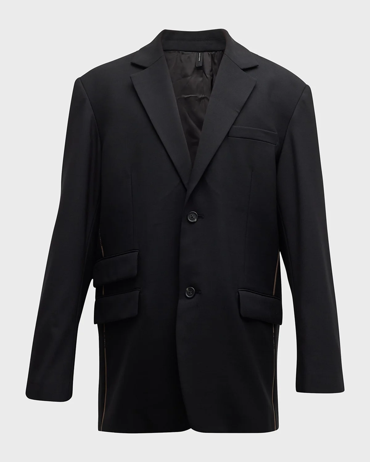 Helmut Lang solid blazer Notched lapels; twobutton front Chest welt pocket Side flap pockets Ticket pocket at right hip Oversized fit Unfinished sleeves Doublevented back Virgin wool/polyester/elastane Lining: Polyester Dry clean Imported