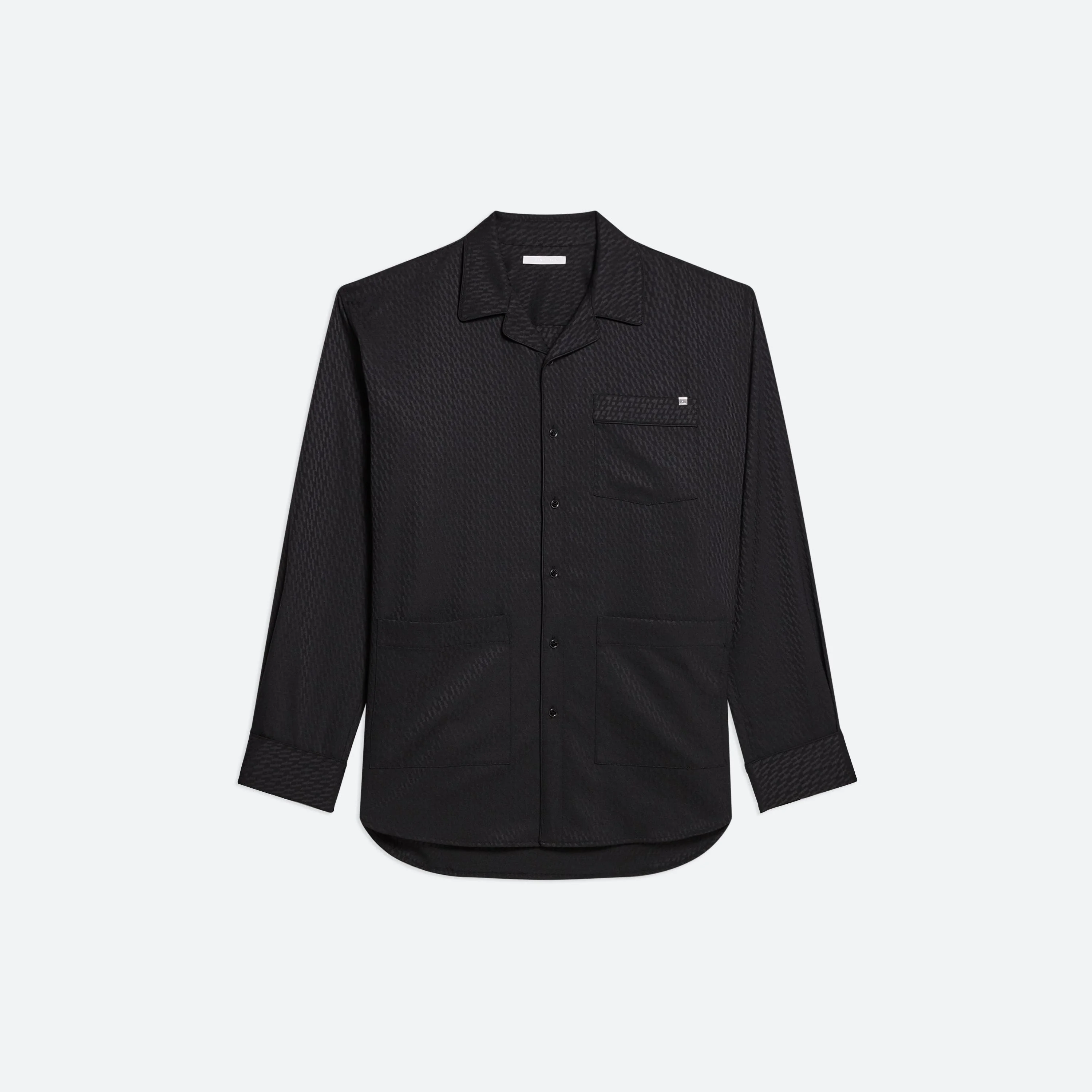 Oversized button-front shirt in satin logo jacquard. Finished with classic pajama details like a convertible collar and piped accents. Matches the Jacquard Car Short. This garment was designed with a unisex fit so you can express your unique style. Fits true to size. Male model is 6'1” and wears size M. Female model is 6’1” and wears size S. DETAILS - Convertible collar - Custom jacquard with tonal HL print - Chest pocket with metal logo clip - Patch pockets at waist - Button front closure and cuffs - Piped accents throughout - Shirttail hem - Oversized fit - O10HM599 MATERIALS & CARE - Composition: 42% polyester, 31% recycled polyester, 25% wool, 2% elastane - Professional dry clean only. - Finished Garment Manufacturing Country/Region: China