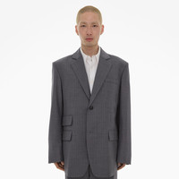 The Helmut Lang Blazer is an oversized style in pinstriped virgin wool with notched lapels, two-button closures, and flap pockets. DETAILS - 100% Virgin Wool - Notched lapels - Long sleeves - Button front closure - Flap pockets - Imported - N09HM104 CARE - Professional dry clean only FIT - Fits true to size - Model is 6’1” and is wearing size 38