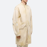 Raw undyed denim jacket with classic parka details like a fishtail hem and drawstring waist. Adjustable straps inside allow the coat to be worn over the shoulders like a backpack. Each jacket is finished by hand with paint and oil staining for a one-of-a-kind patina. Fits true to size. Model is 6’2” and is wearing size M DETAILS - Undyed raw denim - Hand-painted detailing - Zipper closure with hidden snaps - Adjustable interior straps - Snap pockets - Drawstring at waist - Adjustable cuffs - Fishtail hem with snap detail - Riveted metal logo plate at back - O05DM499 MATERIALS & CARE - Composition: 100% Cotton - Machine wash cold with like colors. Do not bleach. - Do not tumble dry. - Lay flat to dry. Cool iron if needed. Do not dry clean. - Finished Garment Manufacturing Country/Region: China - Fabric Production Country/Region: Italy - Weaving Country/Region: (of fabric) Italy - Dyeing Country/Region: (of fabric) Italy - Finishing Country/Region: (of fabric) Italy