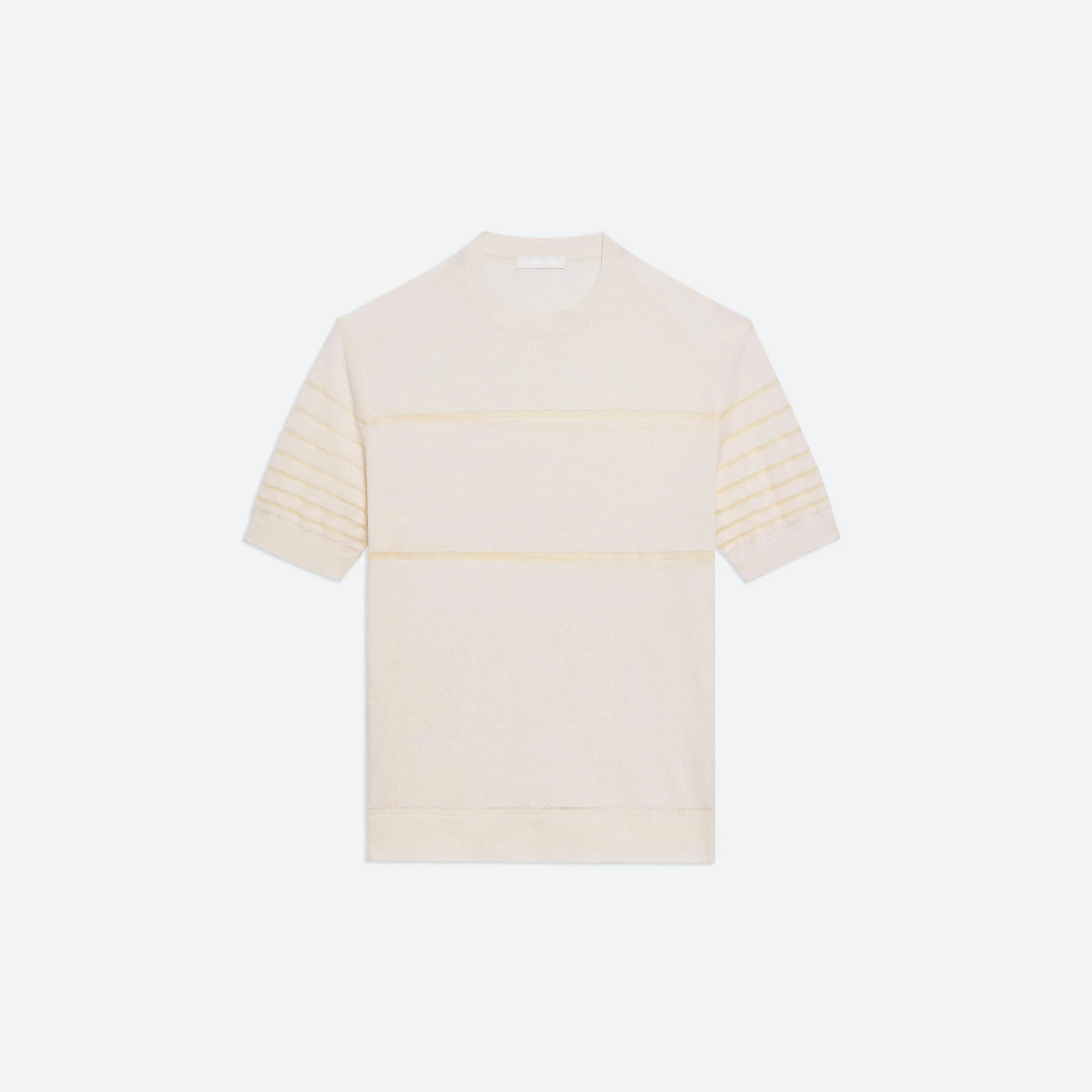 Knitted crew tee with sheer stripe detail in a lightweight linen. Fits true to size. Model is 6’2” and wears size M. DETAILS - Linen knit with sheer stripes - Crewneck - Elbow-length sleeves - Open-weave fagoting detail at hem and cuffs - Relaxed fit - P04HM702 MATERIALS & CARE - Composition: 100% linen - Dry clean with any solvent except trichloroethylene. - Finished Garment Manufacturing Country/Region: China - Fabric Production Country/Region: China - Dyeing Country/Region: (of fabric) China - Finishing Country/Region: (of fabric) China