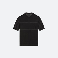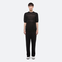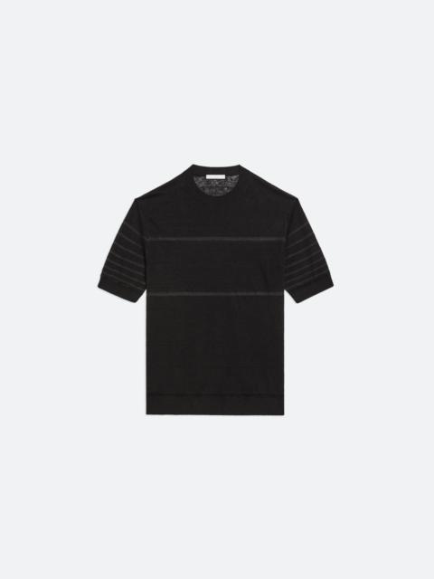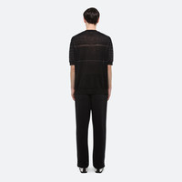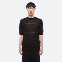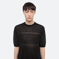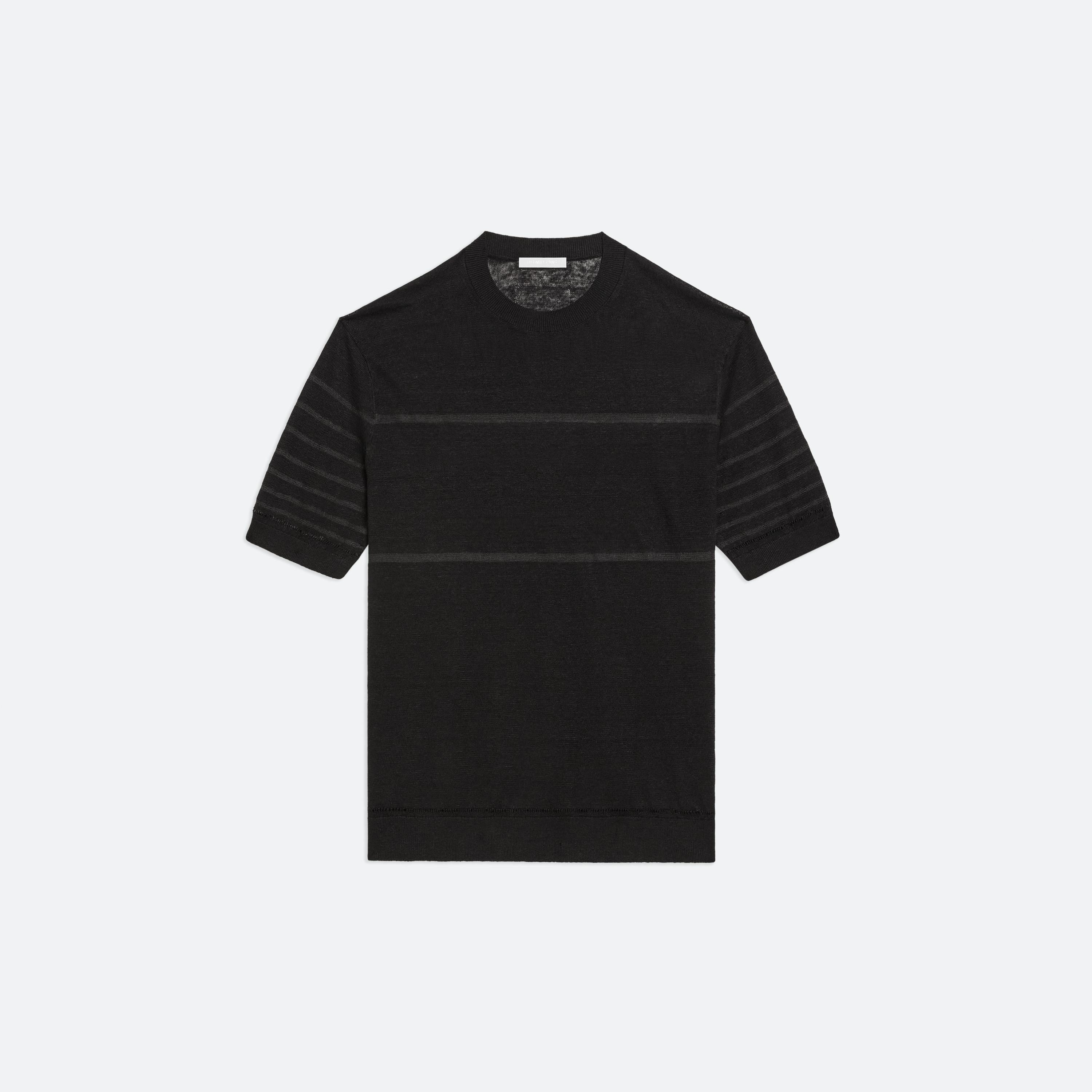 Knitted crew tee with sheer stripe detail in a lightweight linen. Fits true to size. Model is 6’2” and wears size M. DETAILS - Linen knit with sheer stripes - Crewneck - Elbow-length sleeves - Open-weave fagoting detail at hem and cuffs - Relaxed fit - P04HM702 MATERIALS & CARE - Composition: 100% linen - Dry clean with any solvent except trichloroethylene. - Finished Garment Manufacturing Country/Region: China - Fabric Production Country/Region: China - Dyeing Country/Region: (of fabric) China - Finishing Country/Region: (of fabric) China