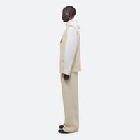Double-breasted sleeveless blazer in lightweight Italian linen suiting. Relaxed fit with peak lapels, flap pockets, hidden waist pockets, and concealed button closures. This garment was designed with a unisex fit so you can express your unique style. Fits oversized. Female model is 5’11” and is wearing size S Male model is 6’2” and is wearing size M DETAILS - Sleeveless style with padded shoulders - Peak lapels - Flap pockets - Waist pockets with invisible zippers - Interior welt pocket - Vent at back - Relaxed, boxy fit - Fully lined - O04HW199 MATERIALS & CARE - Composition: 52% Linen, 46% Viscose, 2% Elastane - Professional dry clean only. Cool iron if needed. - Finished Garment Manufacturing Country/Region: China - Fabric Production Country/Region: Italy - Weaving Country/Region: (of fabric) Italy - Dyeing Country/Region: (of fabric) Italy - Finishing Country/Region: (of fabric) Italy