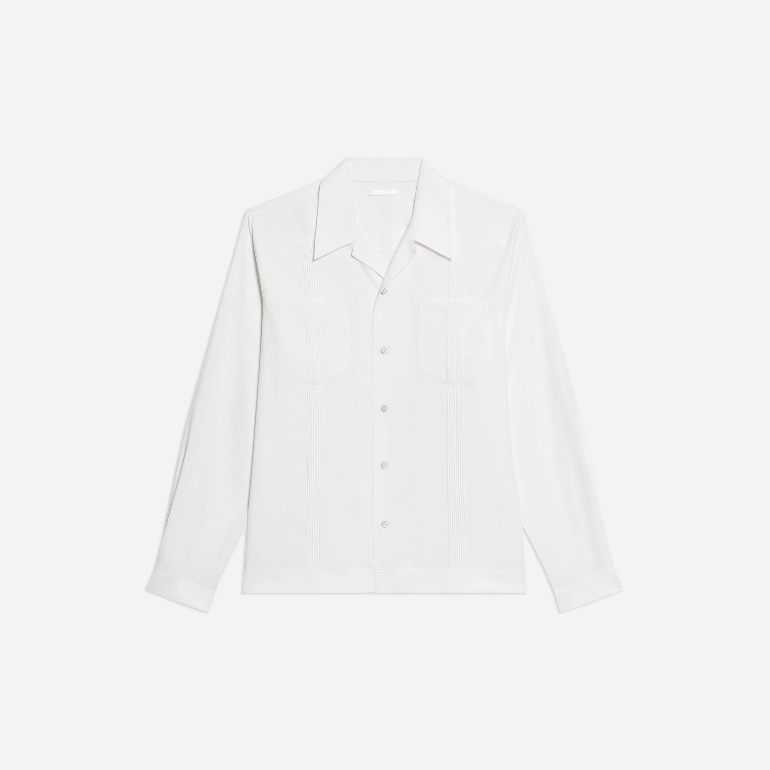 Button-front shirt in soft cotton poplin with pin-tucked details. Fits true to size. Model is 6’1” and wears size M. DETAILS - Convertible collar - Pin-tuck detail on front and back - Western-style yoke - Button-front closure - Patch chest pockets - Side vents - Tonal rubber logo patch on back - Metal-wrapped logo buttons - P01HM509 MATERIALS & CARE - Composition: 100% cotton - Professional dry clean only - Finished Garment Manufacturing Country/Region: China - Fabric Production Country/Region: Japan - Weaving Country/Region: (of fabric) Japan - Dyeing Country/Region: (of fabric) Japan - Finishing Country/Region: (of fabric) Japan