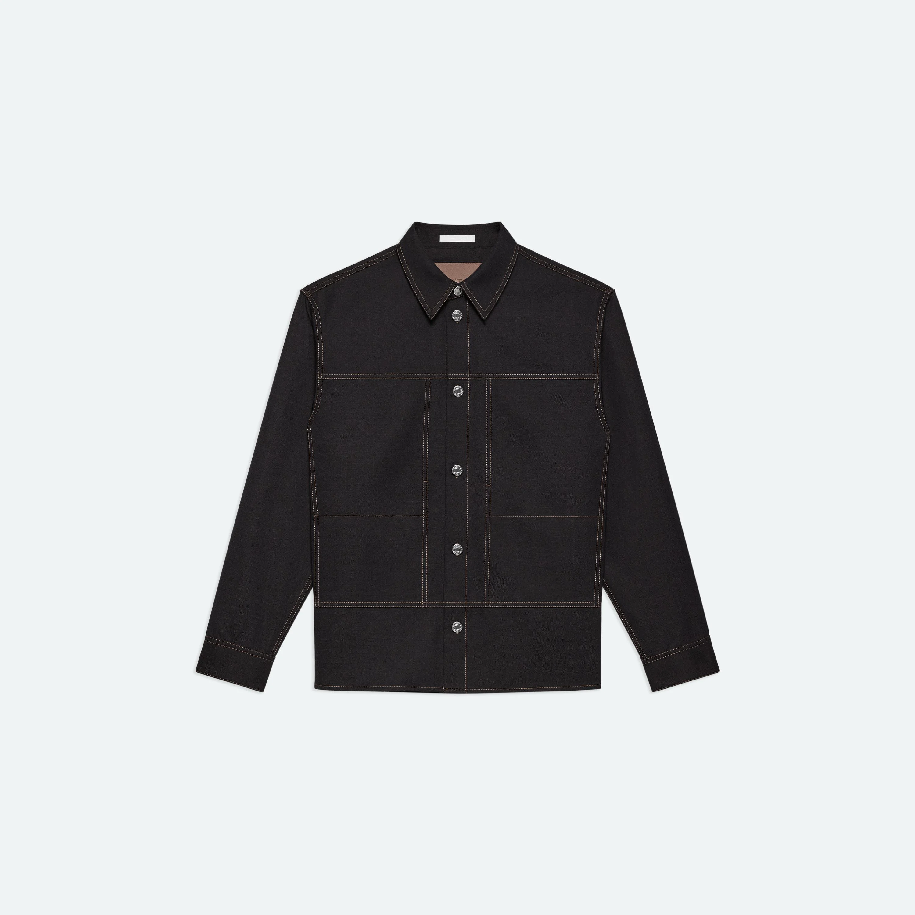 Lightweight jacket in wool gabardine. Features a doubled front pocket inspired by workwear and denim-like contrast stitching. Style with the matching Five-Pocket Trousers. Fits true to size. Model is 6'2" and wears size M. DETAILS - Metal button front closure and cuffs - Doubled front pocket - Button cuffs - Branded leather patch - Q02HM501 MATERIALS & CARE - Composition: 70% recycled polyester, 30% merino wool - Cool iron if needed. Professional dry clean only. - Finished Garment Manufacturing Country/Region: Vietnam - Fabric Production Country/Region: China - Weaving Country/Region: (of fabric) China - Dyeing Country/Region: (of fabric) China - Finishing Country/Region: (of fabric) China