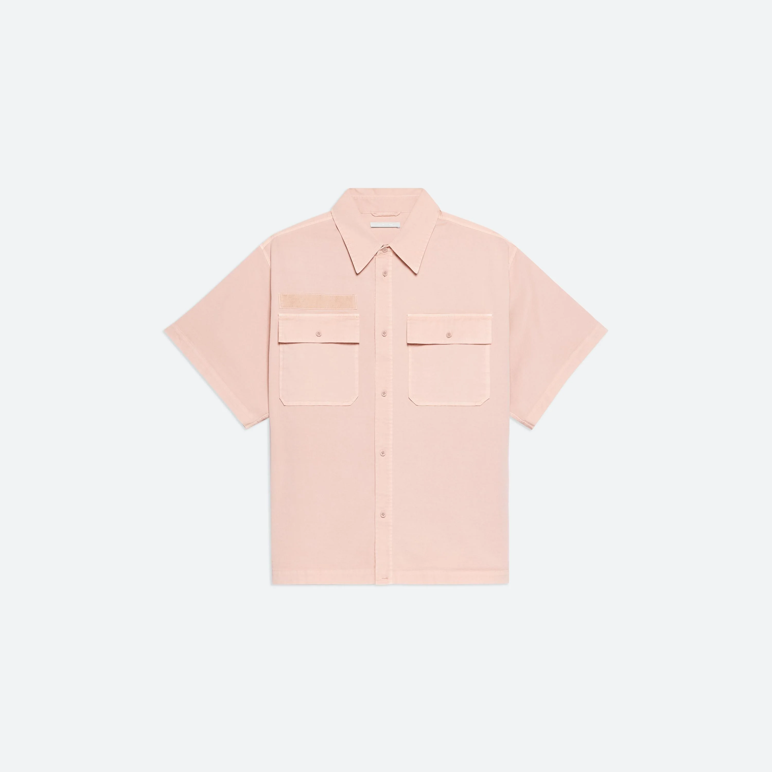 Short-sleeved shirt with classic uniform details in a fine cotton twill. Finished with a garment-dyeing process for a vintage look and lived-in feel. Matches the Garment-Dyed Mini Shorts. / Matches the Cargo Zoot Pants. Fits true to size. Model is 6’2” and wears size M. DETAILS - Pointed collar - Button-front closure - Flap chest pockets - Grosgrain tape detail at chest - Side vents - Classic fit - Leather logo patch at back - P05HM503 MATERIALS & CARE - Composition: 96% cotton, 4% elastane - Machine wash cold gentle cycle with like colors. Do not bleach. Lay flat to dry in shade. Cool iron if needed. Do not tumble dry. - Finished Garment Manufacturing Country/Region: China - Fabric Production Country/Region: Italy - Weaving Country/Region: (of fabric) Pakistan - Dyeing Country/Region: (of fabric) Italy - Finishing Country/Region: (of fabric) Italy