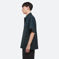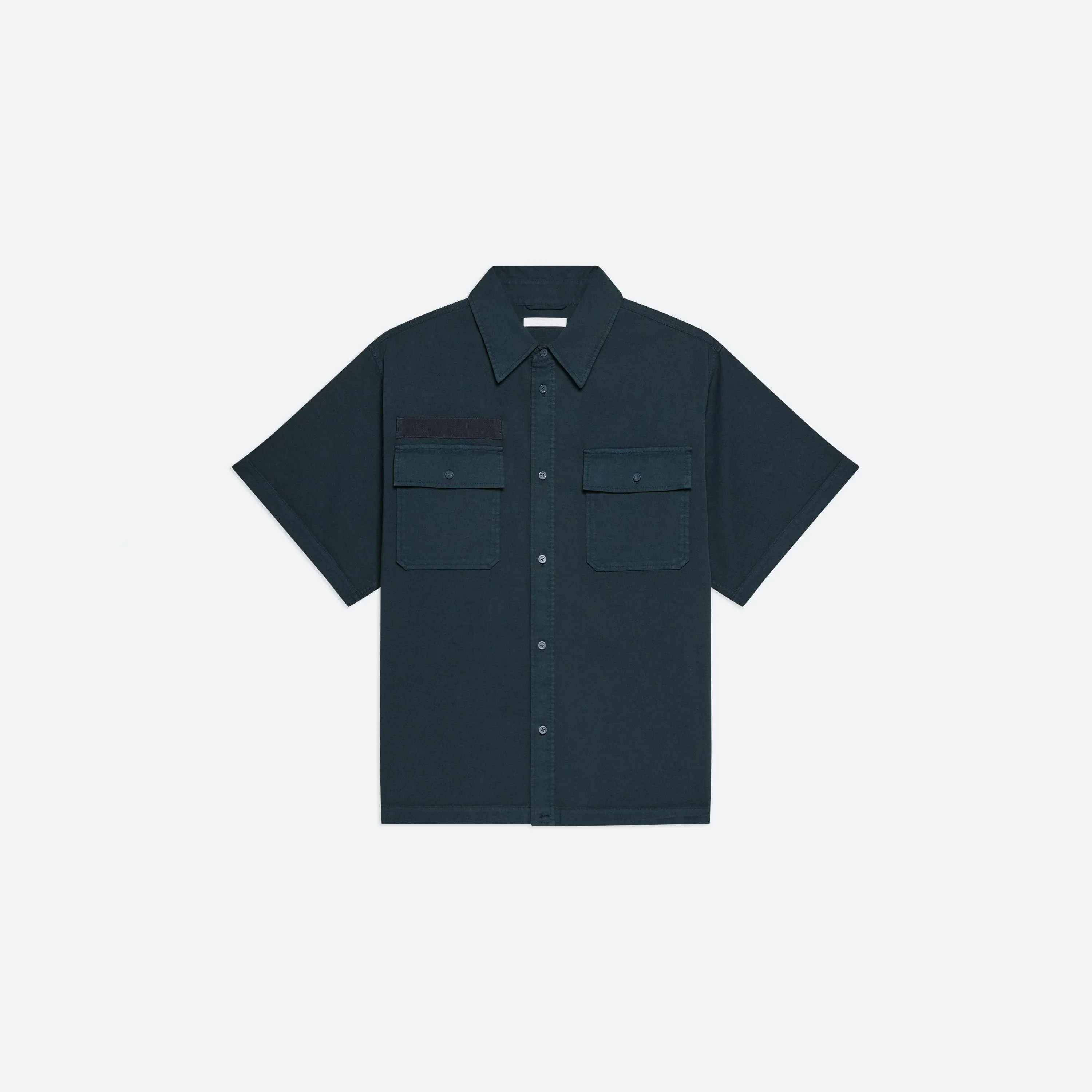 Short-sleeved shirt with classic uniform details in a fine cotton twill. Finished with a garment-dyeing process for a vintage look and lived-in feel. Matches the Garment-Dyed Mini Shorts. / Matches the Cargo Zoot Pants. Fits true to size. Model is 6’2” and wears size M. DETAILS - Pointed collar - Button-front closure - Flap chest pockets - Grosgrain tape detail at chest - Side vents - Classic fit - Leather logo patch at back - P05HM503 MATERIALS & CARE - Composition: 96% cotton, 4% elastane - Machine wash cold gentle cycle with like colors. Do not bleach. Lay flat to dry in shade. Cool iron if needed. Do not tumble dry. - Finished Garment Manufacturing Country/Region: China - Fabric Production Country/Region: Italy - Weaving Country/Region: (of fabric) Pakistan - Dyeing Country/Region: (of fabric) Italy - Finishing Country/Region: (of fabric) Italy