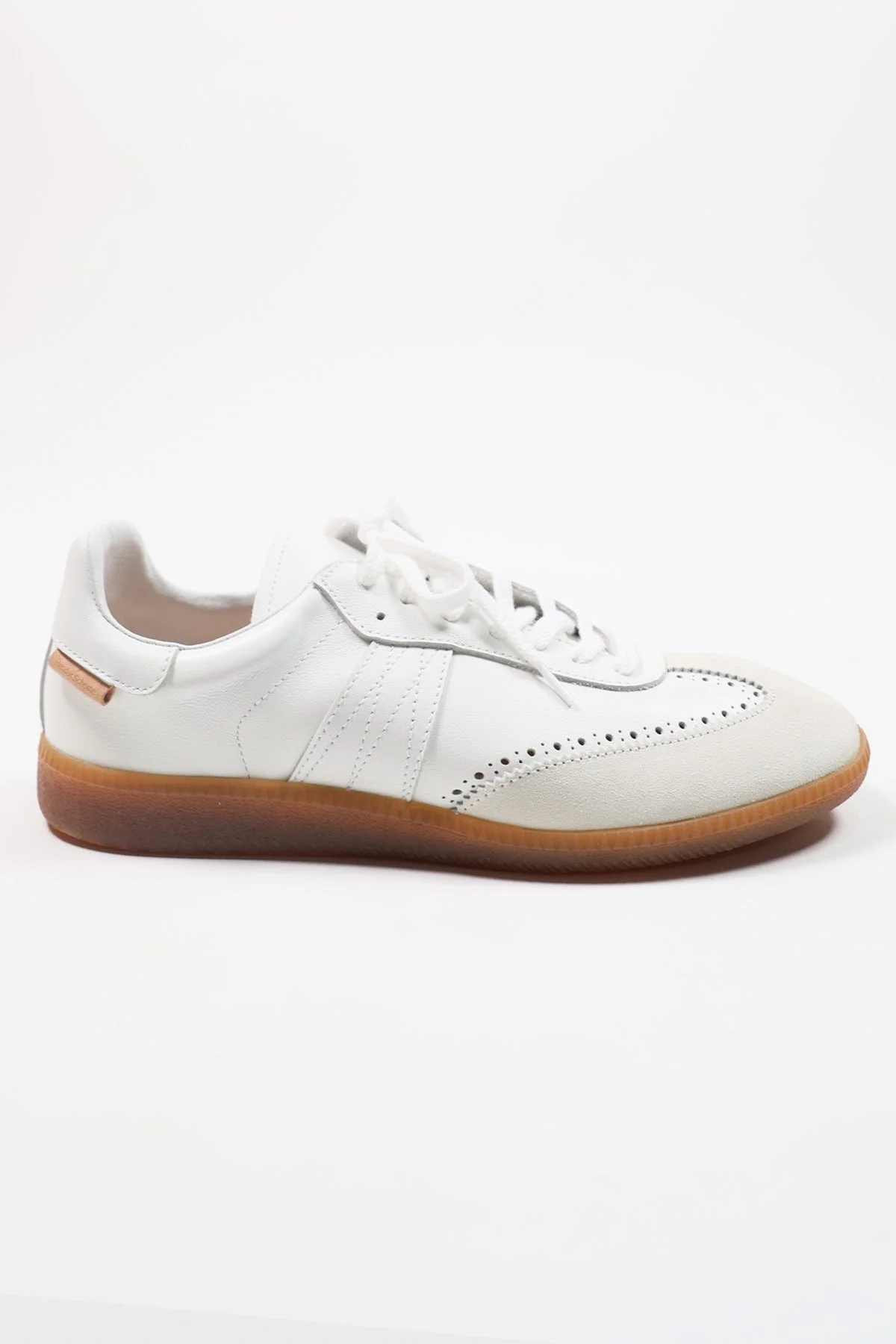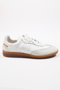 The Citizen Trainer is a great take on vintage military trainers. All the classic design work through perforation and low top style cut in a premium suede leather and gum sole for a perfect everyday shoe that is extremely comfortable but also effortlessly stylish. Fits true to size. - Suede Upper - Brogue Toe - Gum Sole - Tonal Lacing - Made in Japan - White